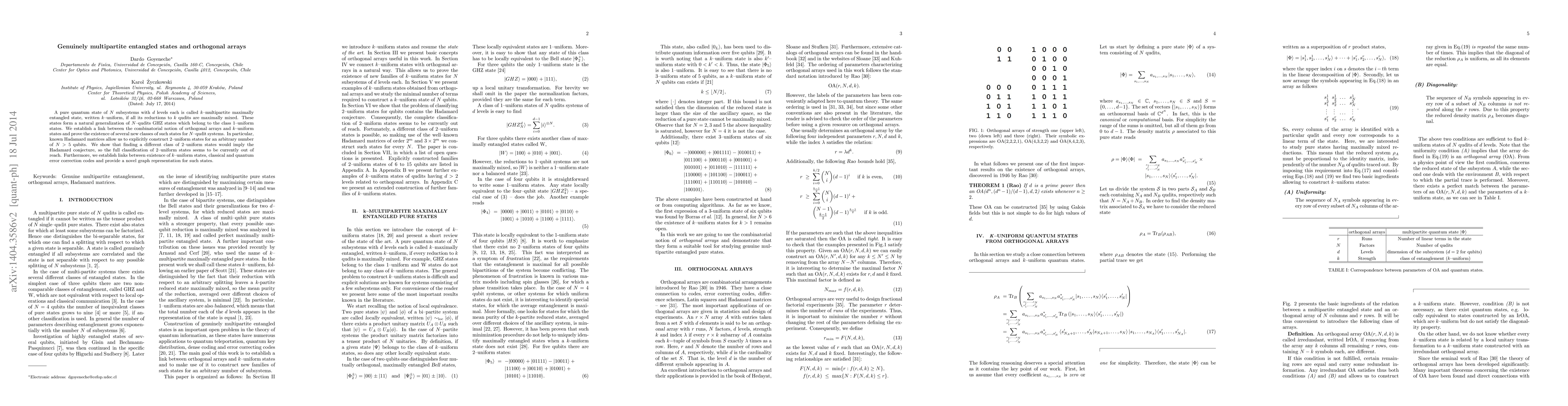 This paper explores k-uniform entangled states, a generalization of GHZ states, and establishes a connection between these quantum states and orthogonal arrays. It constructs 2-uniform states using Hadamard matrices and discusses the implications for the Hadamard conjecture, while also linking these states to classical and quantum error correction codes and introducing a new graph representation.