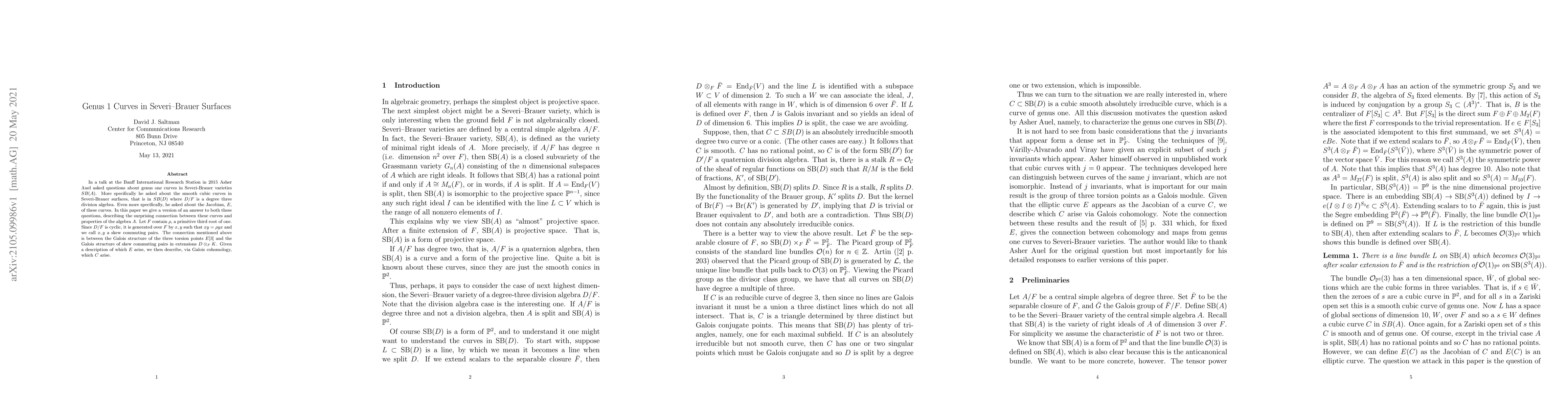 In a talk at the Banff International Research Station in 2015 Asher Auel asked questions about genus one curves in Severi-Brauer varieties $SB(A)$. More specifically he asked about the smooth cubic curves in Severi-Brauer surfaces, that is in $SB(D)$ where $D/F$ is a degree three division algebra. Even more specifically, he asked about the Jacobian, $E$, of these curves. In this paper we give a version of an answer to both these questions, describing the surprising connection between these curves and properties of the algebra $A$. Let $F$ contain $\rho$, a primitive third root of one. Since $D/F$ is cyclic, it is generated over $F$ by $x,y$ such that $xy = \rho{yx}$ and we call $x,y$ a skew commuting pairs. The connection mentioned above is between the Galois structure of the three torsion points $E[3]$ and the Galois structure of skew commuting pairs in extensions $D \otimes_F K$. Given a description of which $E$ arise, we then describe, via Galois cohomology, which $C$ arise.