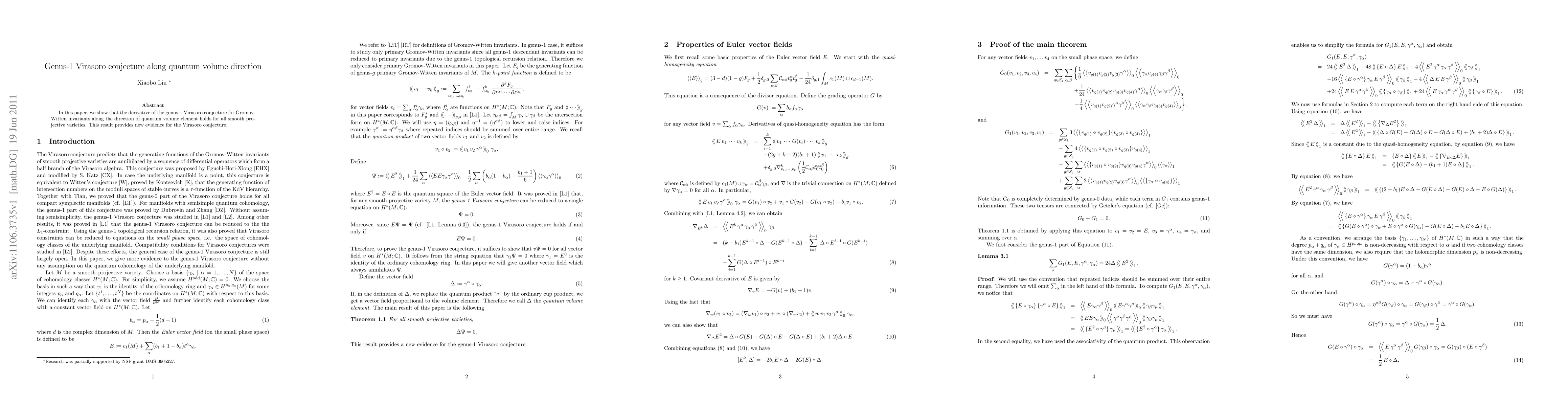 The paper demonstrates that the derivative of the genus-1 Virasoro conjecture for Gromov-Witten invariants holds for all smooth projective varieties when considered along the quantum volume direction, thereby offering new evidence supporting the Virasoro conjecture.