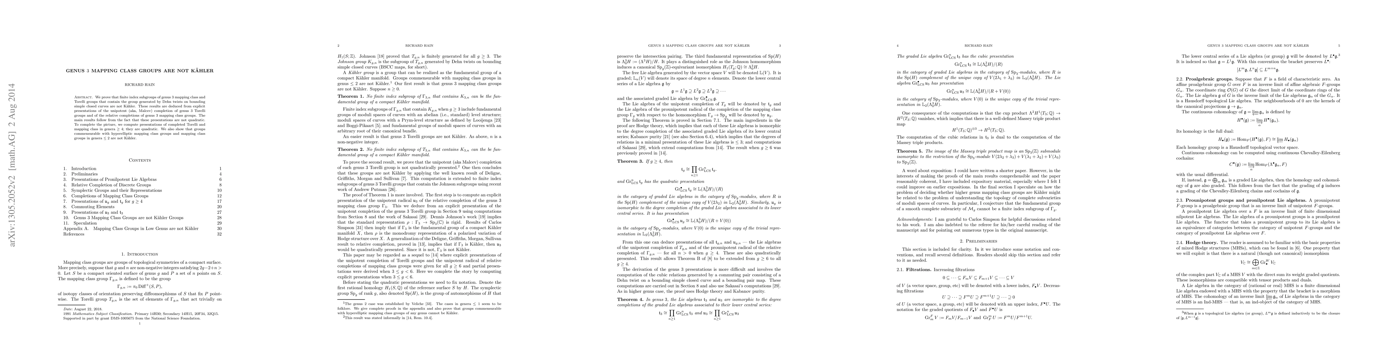 This paper demonstrates that finite index subgroups of genus 3 mapping class and Torelli groups, containing Dehn twists, are not Kähler due to non-quadratic presentations of their unipotent completions. In contrast, presentations for genera greater than 3 are quadratic.