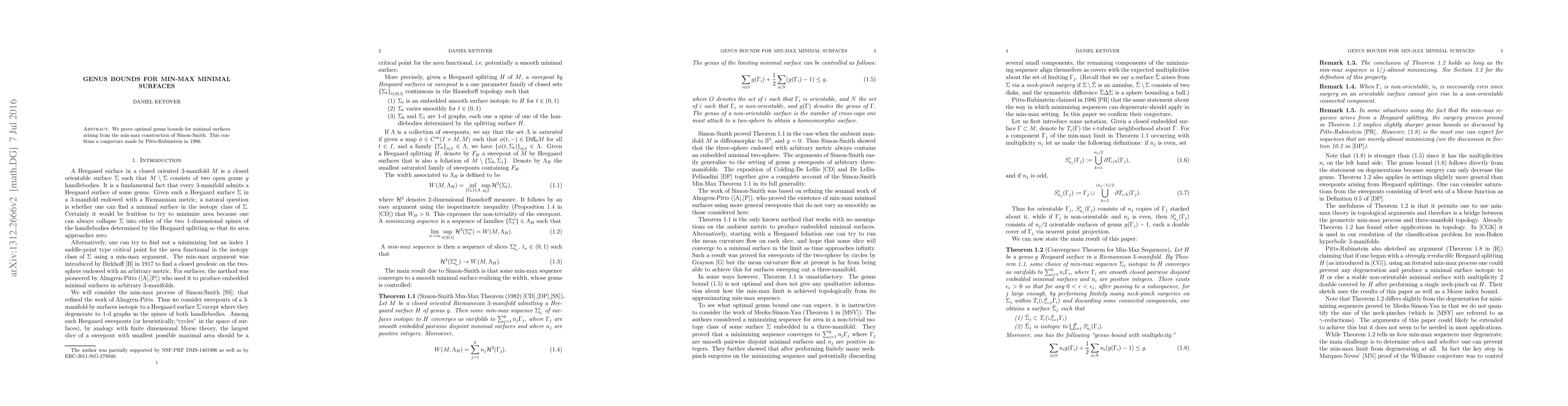 Summary: This paper establishes optimal genus bounds for minimal surfaces generated via the min-max construction, confirming a 1986 conjecture by Pitts-Rubinstein. The results provide a definitive answer to the conjecture regarding the genus of such minimal surfaces.