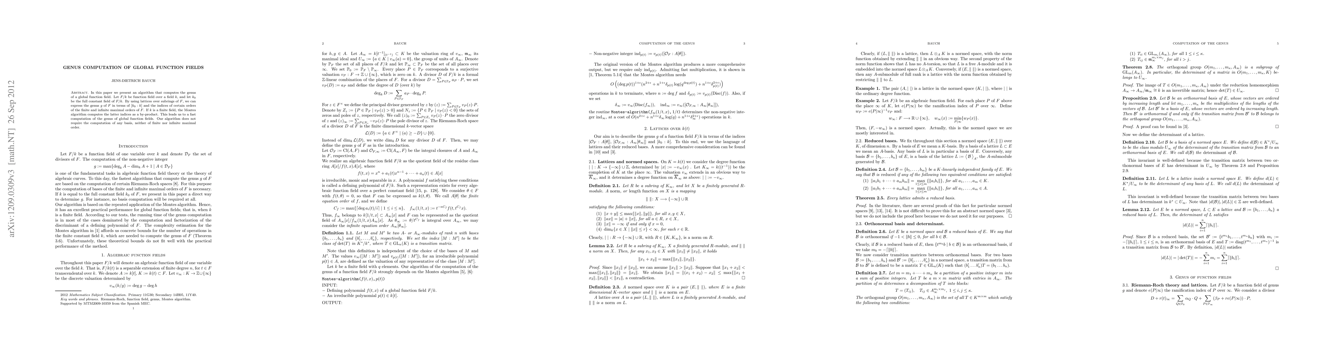 In this paper we present an algorithm that computes the genus of a global function field. Let F/k be function field over a field k, and let k0 be the full constant field of F/k. By using lattices over subrings of F, we can express the genus g of F in terms of [k0 : k] and the indices of certain orders of the finite and infinite maximal orders of F . If k is a finite field, the Montes algorithm computes the latter indices as a by-product. This leads us to a fast computation of the genus of global function fields. Our algorithm does not require the computation of any basis, neither of finite nor infinite maximal order.