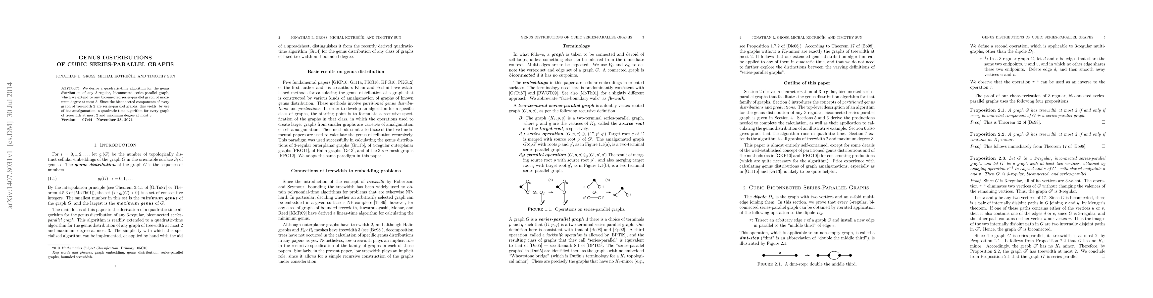 We derive a quadratic-time algorithm for the genus distribution of any 3-regular, biconnected series-parallel graph, which we extend to any biconnected series-parallel graph of maximum degree at most 3. Since the biconnected components of every graph of treewidth 2 are series-parallel graphs, this yields, by use of bar-amalgamation, a quadratic-time algorithm for every graph of treewidth at most 2 and maximum degree at most 3.