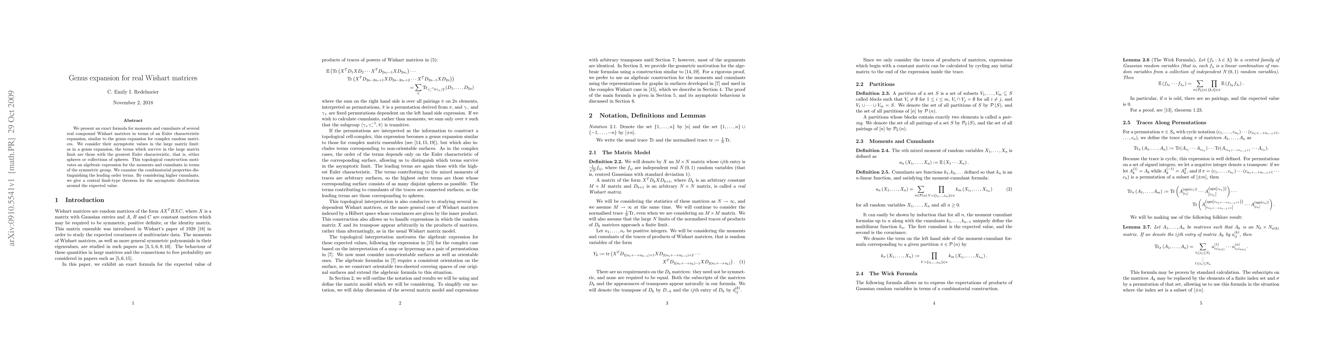 We present an exact formula for moments and cumulants of several real compound Wishart matrices in terms of an Euler characteristic expansion, similar to the genus expansion for complex random matrices. We consider their asymptotic values in the large matrix limit: as in a genus expansion, the terms which survive in the large matrix limit are those with the greatest Euler characteristic, that is, either spheres or collections of spheres. This topological construction motivates an algebraic expression for the moments and cumulants in terms of the symmetric group. We examine the combinatorial properties distinguishing the leading order terms. By considering higher cumulants, we give a central limit-type theorem for the asymptotic distribution around the expected value.