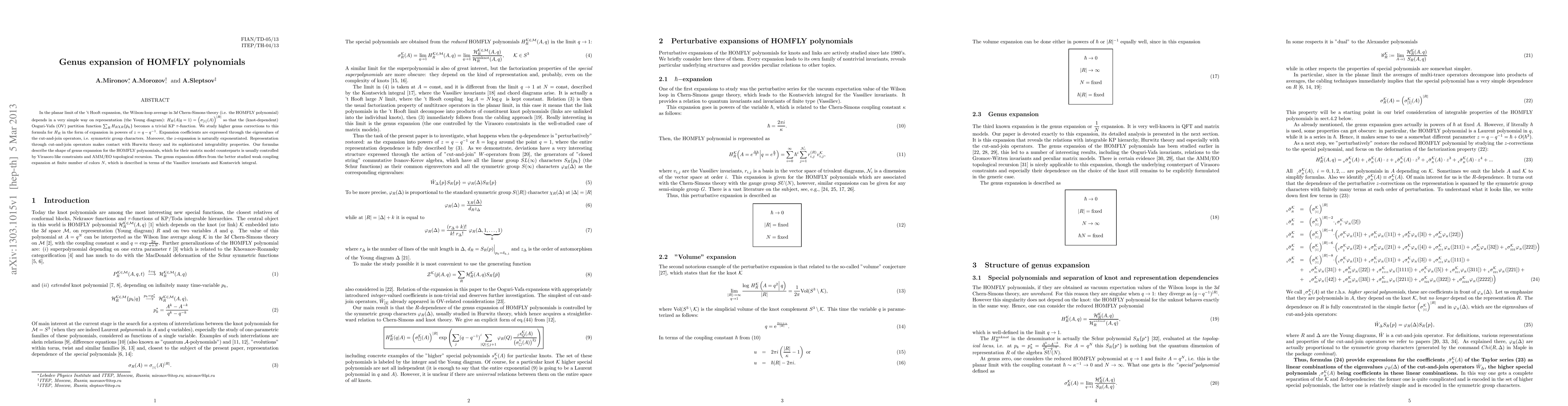 This paper investigates higher genus corrections to the HOMFLY polynomial in the planar limit of 3d Chern-Simons theory, expressing expansion coefficients via symmetric group characters and cut-and-join operators. It contrasts the genus expansion with the weak coupling expansion, highlighting its unique integrability properties.