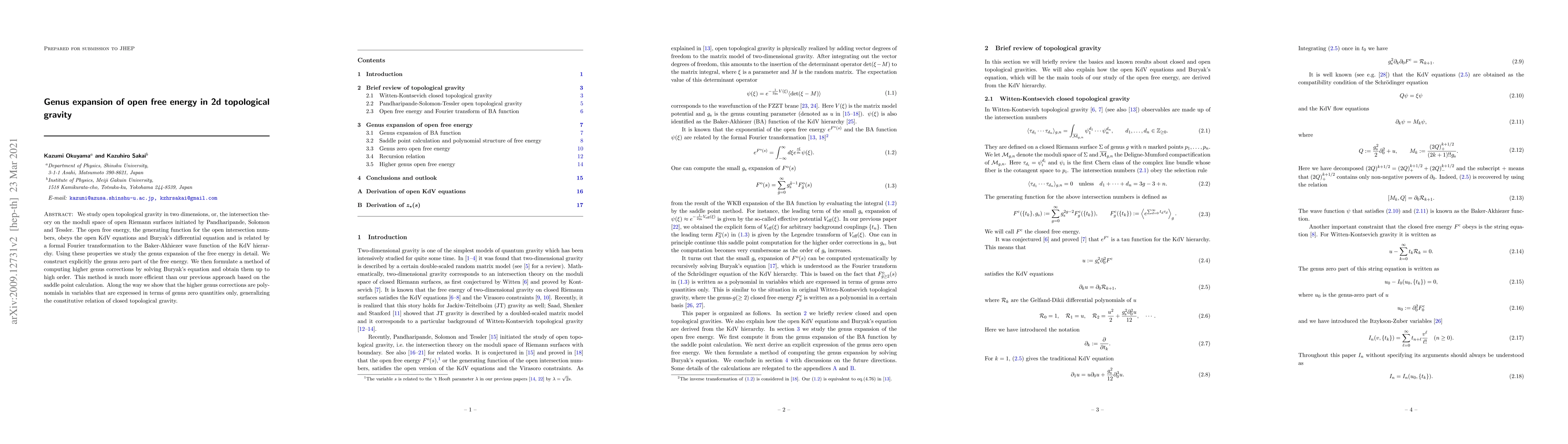This paper explores open topological gravity in two dimensions, focusing on the genus expansion of the open free energy. The authors construct the genus zero part explicitly and develop a new method for computing higher genus corrections efficiently, demonstrating that these corrections are polynomials based on genus zero quantities.