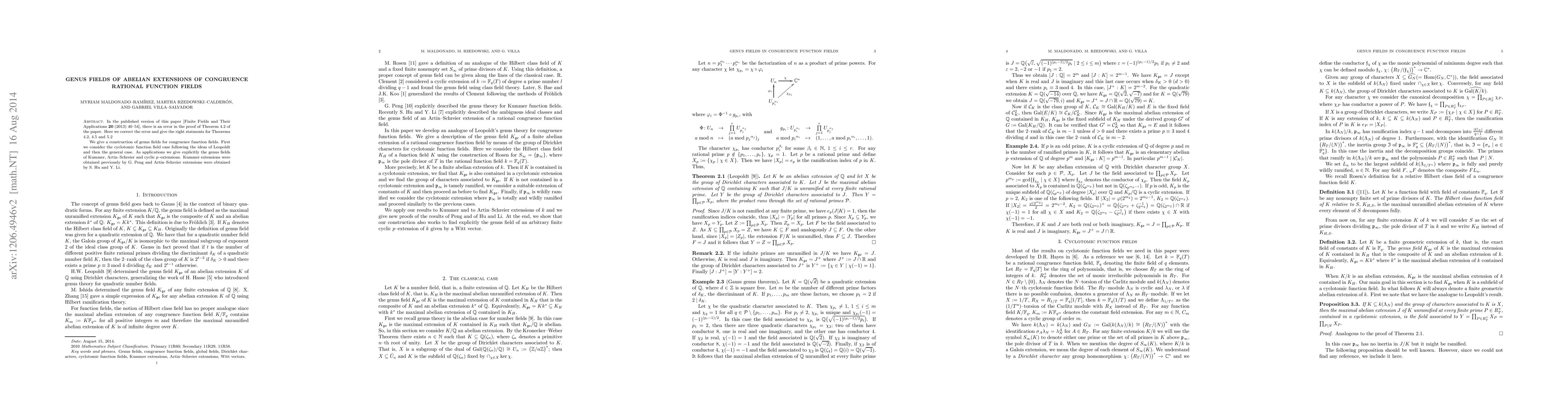 This paper corrects an error in the proof of Theorem 4.2 and provides accurate statements for Theorems 4.2, 4.5, and 5.2 regarding genus fields of abelian extensions of congruence rational function fields. It constructs genus fields for cyclotomic and general function fields, and explicitly details the genus fields for Kummer, Artin-Schreier, and cyclic p-extensions.