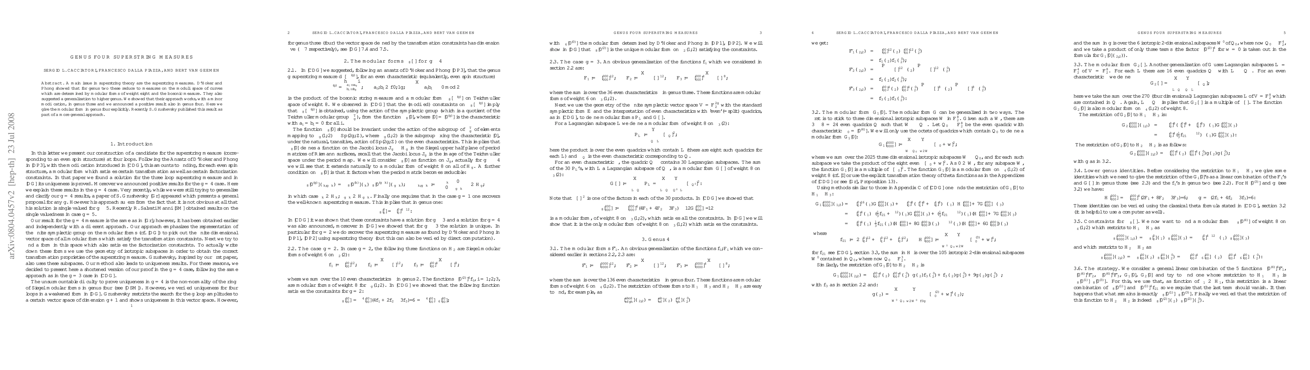 A main issue in superstring theory are the superstring measures. D'Hoker and Phong showed that for genus two these reduce to measures on the moduli space of curves which are determined by modular forms of weight eight and the bosonic measure. They also suggested a generalisation to higher genus. We showed that their approach works, with a minor modification, in genus three and we announced a positive result also in genus four. Here we give the modular form in genus four explicitly. Recently S. Grushevsky published this result as part of a more general approach.
