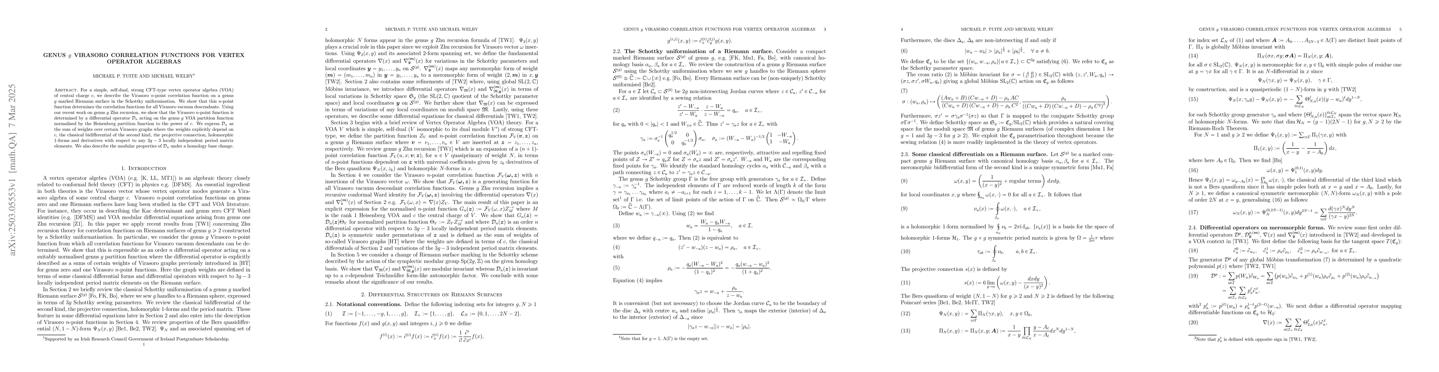 The paper describes the Virasoro n-point correlation functions on a genus g marked Riemann surface using a Schottky uniformization, showing that these functions determine all Virasoro vacuum descendants. It utilizes recent work on genus g Zhu recursion to express the Virasoro n-point function as a differential operator acting on the genus g VOA partition function, normalized by the Heisenberg partition function raised to the power of c.