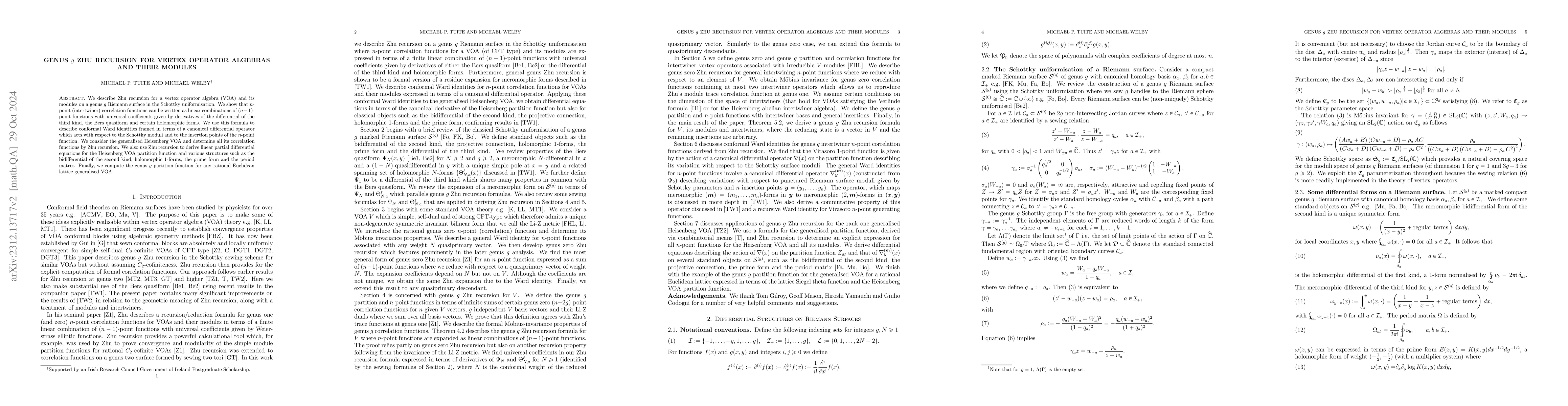 We describe Zhu recursion for a vertex operator algebra (VOA) and its modules on a genus $g$ Riemann surface in the Schottky uniformisation. We show that $n$-point (intertwiner) correlation functions are written as linear combinations of $(n-1)$-point functions with universal coefficients given by derivatives of the differential of the third kind, the Bers quasiform and certain holomorphic forms. We use this formula to describe conformal Ward identities framed in terms of a canonical differential operator which acts with respect to the Schottky moduli and to the insertion points of the $n$-point function. We consider the generalised Heisenberg VOA and determine all its correlation functions by Zhu recursion. We also use Zhu recursion to derive linear partial differential equations for the Heisenberg VOA partition function and various structures such as the bidifferential of the second kind, holomorphic $1$-forms, the prime form and the period matrix. Finally, we compute the genus $g$ partition function for any rational Euclidean lattice generalised VOA.