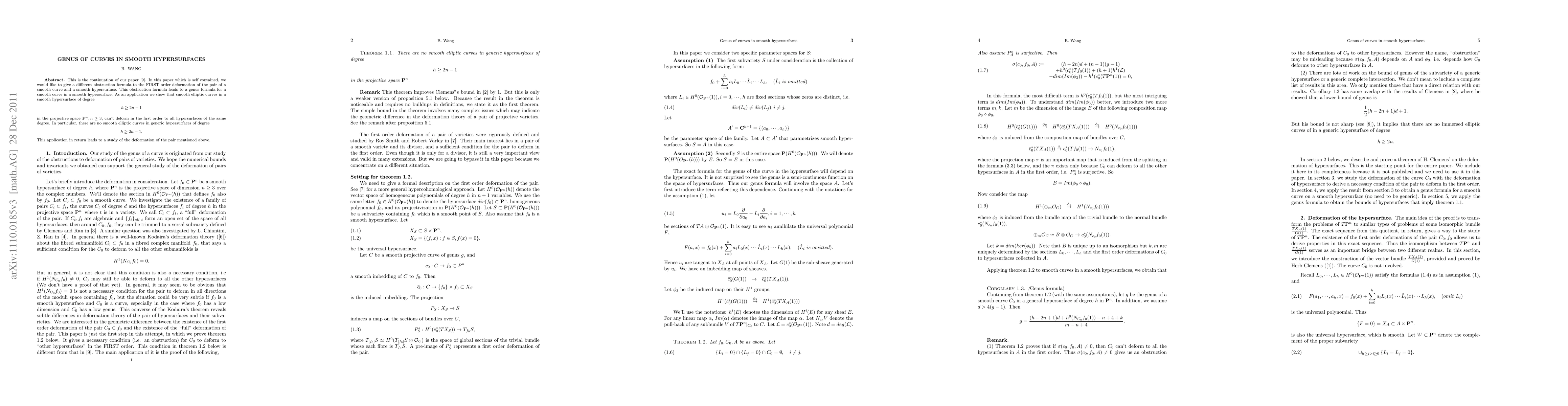 This is the continuation of our paper [10]. In this paper which is self contained, we would like to give a different obstruction formula to the FIRST order deformation of the pair of a smooth curve and a smooth hypersurface. This obstruction formula leads to a genus formula for a smooth curve in a smooth hypersurface. As an application we show that smooth elliptic curves in a smooth hypersurface of degree $$h\geq 2n-1$$ in the projective space $\mathbf P^n, n\geq 3,$ can't deform in the first order to all hypersurfaces of the same degree. In particular, there are no smooth elliptic curves in generic hypersurfaces of degree $$h\geq 2n-1.$$ This application in return leads to a study of the deformation of the pair mentioned above.