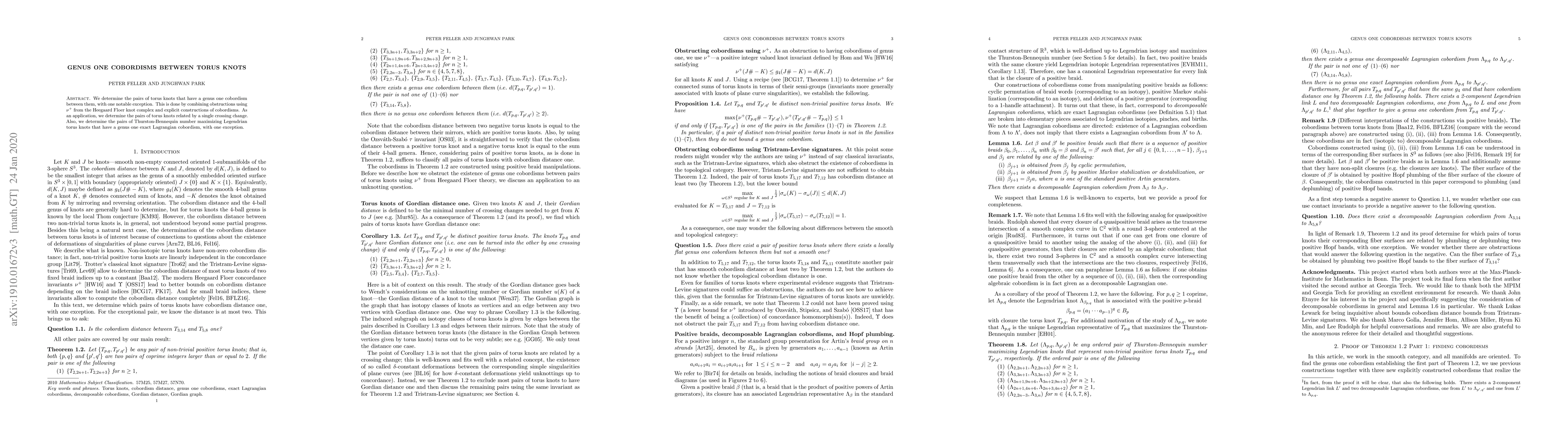 This paper identifies pairs of torus knots that share a genus one cobordism, utilizing Heegaard Floer knot theory and explicit cobordism constructions. It also explores crossing changes and cobordisms between knots maximizing Thurston-Bennequin numbers, with specific exceptions noted.
