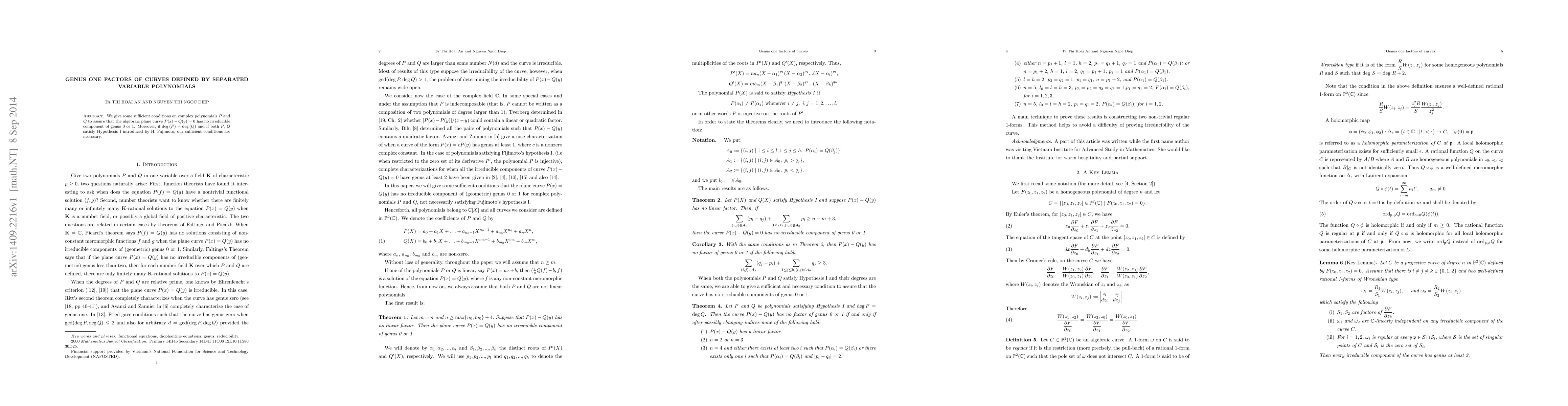 This paper provides conditions for complex polynomials to ensure no irreducible components of genus 0 or 1 in a curve defined by separated variable polynomials.