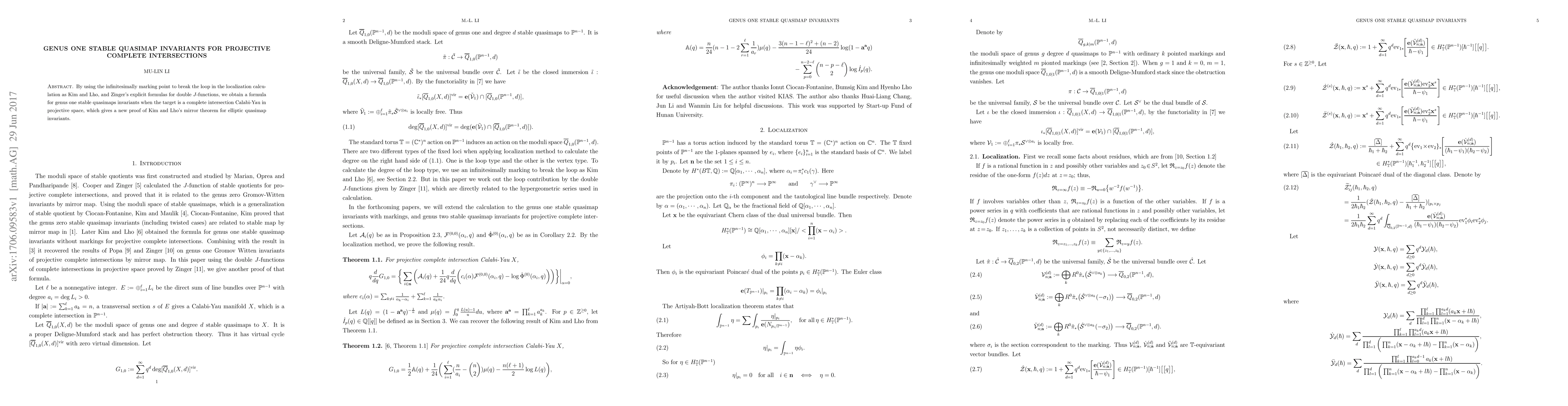 By using the infinitesimally marking point to break the loop in the localization calculation as Kim and Lho, and Zinger's explicit formulas for double $J$-functions, we obtain a formula for genus one stable quasimaps invariants when the target is a complete intersection Calabi-Yau in projective space, which gives a new proof of Kim and Lho's mirror theorem for elliptic quasimap invariants.