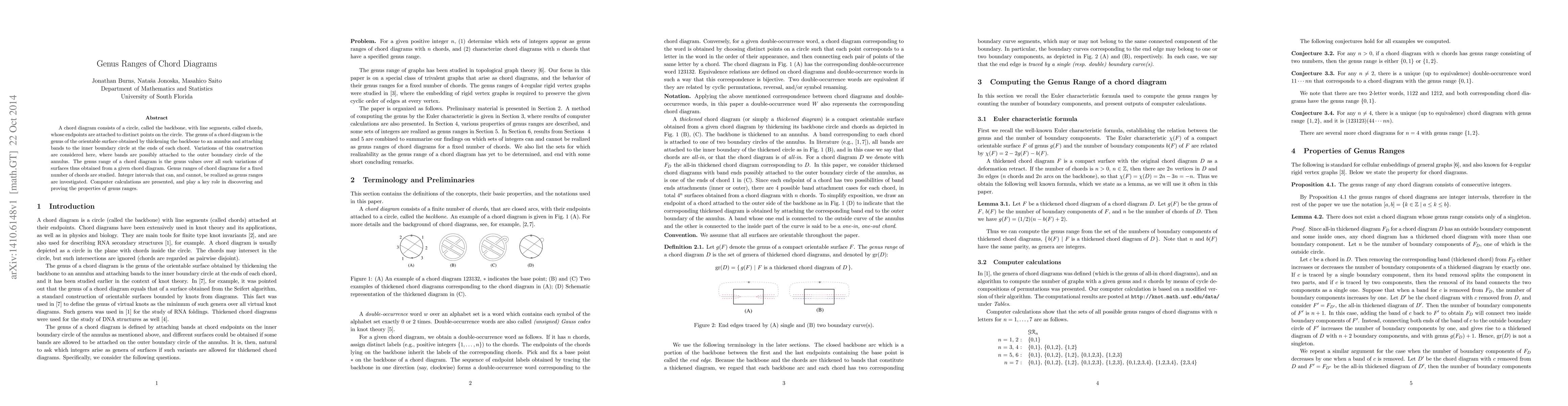 A chord diagram consists of a circle, called the backbone, with line segments, called chords, whose endpoints are attached to distinct points on the circle. The genus of a chord diagram is the genus of the orientable surface obtained by thickening the backbone to an annulus and attaching bands to the inner boundary circle at the ends of each chord. Variations of this construction are considered here, where bands are possibly attached to the outer boundary circle of the annulus. The genus range of a chord diagram is the genus values over all such variations of surfaces thus obtained from a given chord diagram. Genus ranges of chord diagrams for a fixed number of chords are studied. Integer intervals that can, and cannot, be realized as genus ranges are investigated. Computer calculations are presented, and play a key role in discovering and proving the properties of genus ranges.