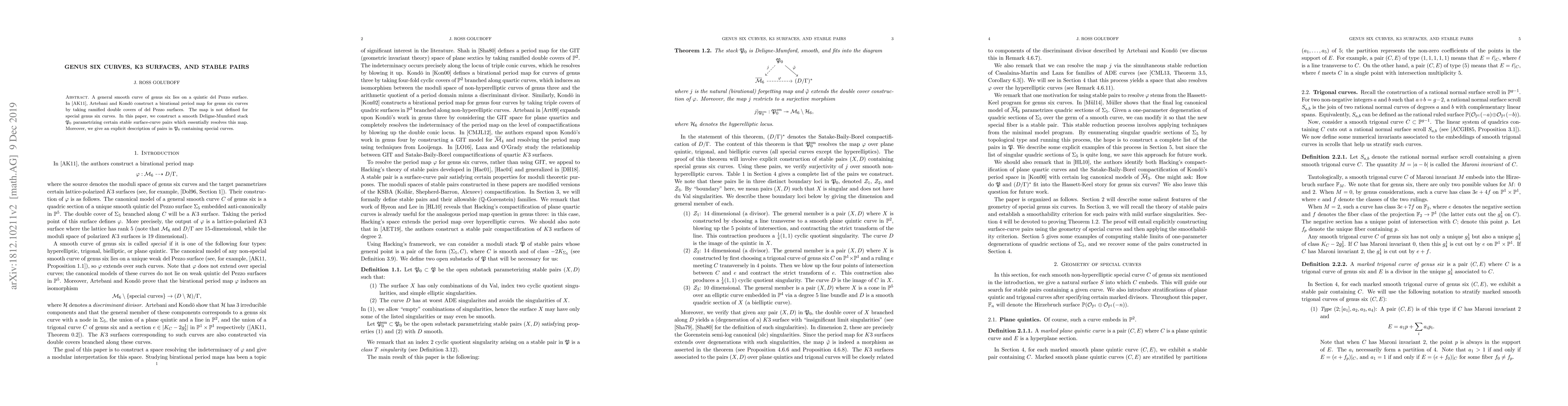 A general smooth curve of genus six lies on a quintic del Pezzo surface. In \cite{AK11}, Artebani and Kond\=o construct a birational period map for genus six curves by taking ramified double covers of del Pezzo surfaces. The map is not defined for special genus six curves. In this paper, we construct a smooth Deligne-Mumford stack $\mathfrak{P}_0$ parametrizing certain stable surface-curve pairs which essentially resolves this map. Moreover, we give an explicit description of pairs in $\mathfrak{P}_0$ containing special curves.