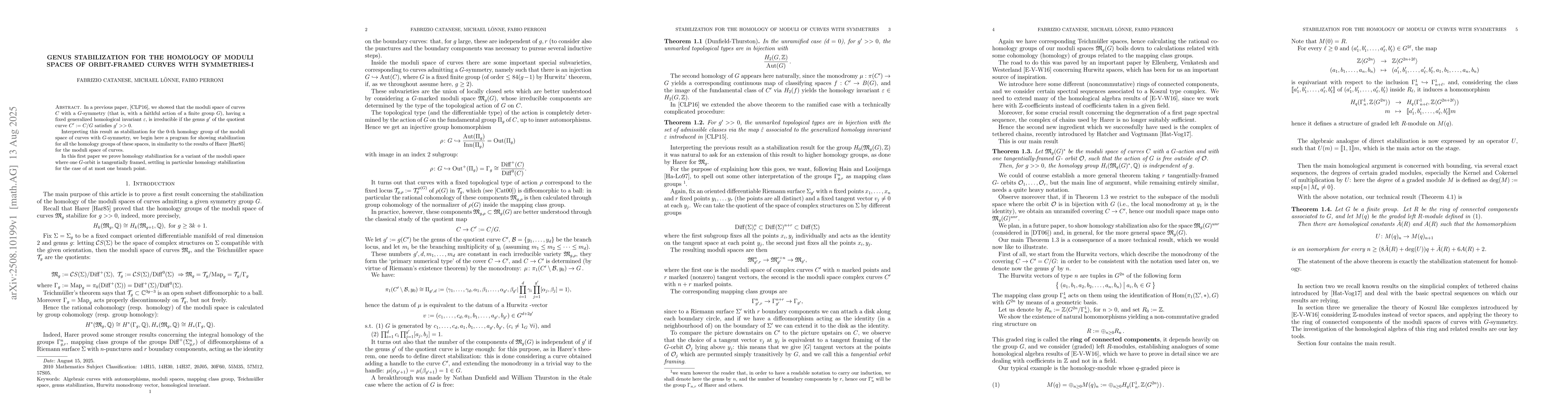 In a previous paper, arXiv:1301.4409, we showed that the moduli space of curves C with a G-symmetry (that is, with a faithful action of a finite group G), having a fixed generalized homological invariant, is irreducible if the genus g' of the quotient curve C' : = C/G satisfies g'>>0. Interpreting this result as stabilization for the 0-th homology group of the moduli space of curves with G-symmetry, we begin here a program for showing stabilization for all the homology groups of these spaces, in similarity to the results of Harer for the moduli space of curves. In this first paper we prove homology stabilization for a variant of the moduli space where one G-orbit is tangentially framed, settling in particular homology stabilization for the case of at most one branch point.