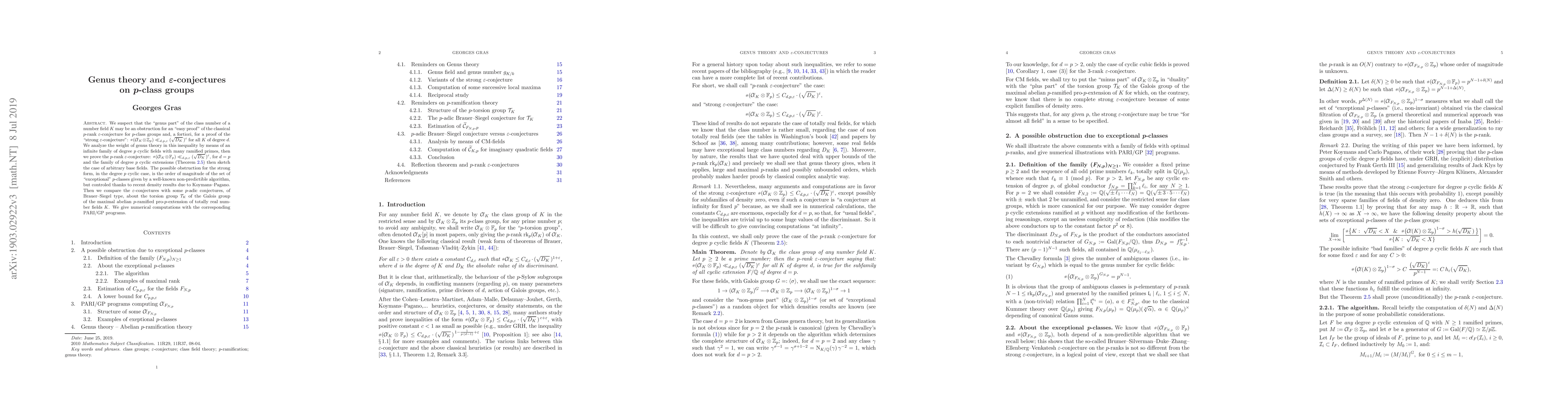 We suspect that the ``genus part'' of the class number of a number field K may be an obstruction for an ``easy proof'' of the classical p-rank epsilon-conjecture for p-class groups and, a fortiori, for a proof of the ``strong epsilon-conjecture'': \# (Cl\_K \otimes \Z\_p) <<\_(d,p,epsilon) ($\sqrt$D\_K)^epsilon for all K of degree d. We analyze the weight of genus theory in this inequality by means of an infinite family of degree p cyclic fields with many ramified primes, then we prove the p-rank epsilon-conjecture: \# (Cl\_K \otimes \F\_p) <<\_(d,p,epsilon) ($\sqrt$D\_K)^epsilon, for d=p and the family of degree p cyclic extensions (Theorem 2.5) then sketch the case of arbitrary base fields. The possible obstruction for the strong form, in the degree p cyclic case, is the order of magnitude of the set of ``exceptional'' p-classes given by a well-known non-predictible algorithm, but controled thanks to recent density results due to Koymans--Pagano. Then we compare the epsilon-conjectures with some p-adic conjectures, of Brauer- Siegel type, about the torsion group T\_K of the Galois group of the maximal abelian p-ramified pro-p-extension of totally real number fields K. We give numerical computations with the corresponding PARI/GP programs.