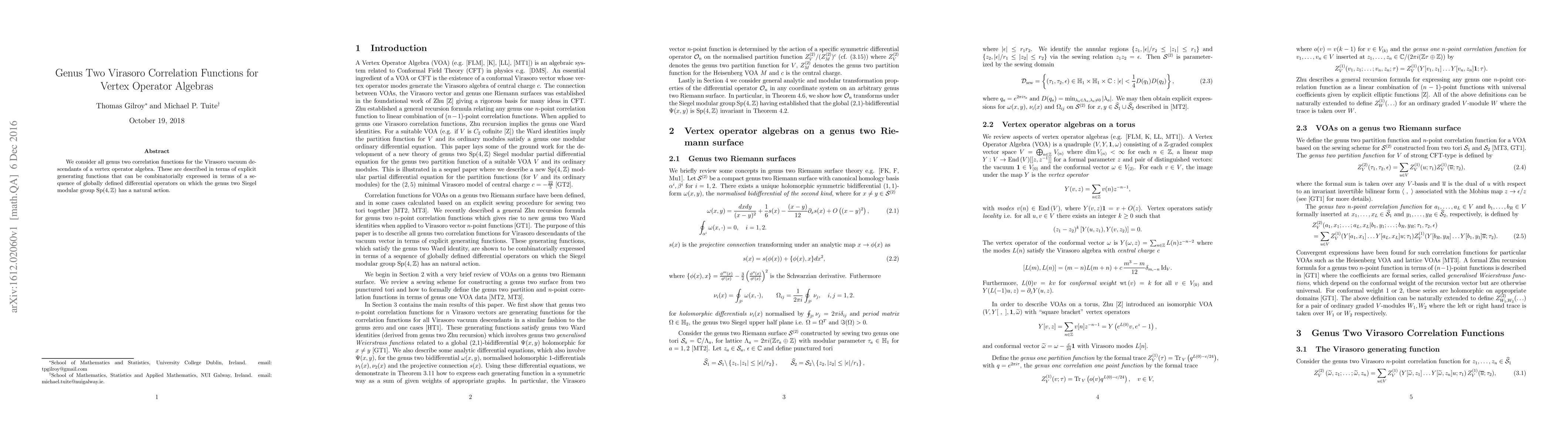 We consider all genus two correlation functions for the Virasoro vacuum descendants of a vertex operator algebra. These are described in terms of explicit generating functions that can be combinatorially expressed in terms of a sequence of globally defined differential operators on which the genus two Siegel modular group $Sp(4,\mathbb{Z})$ has a natural action.