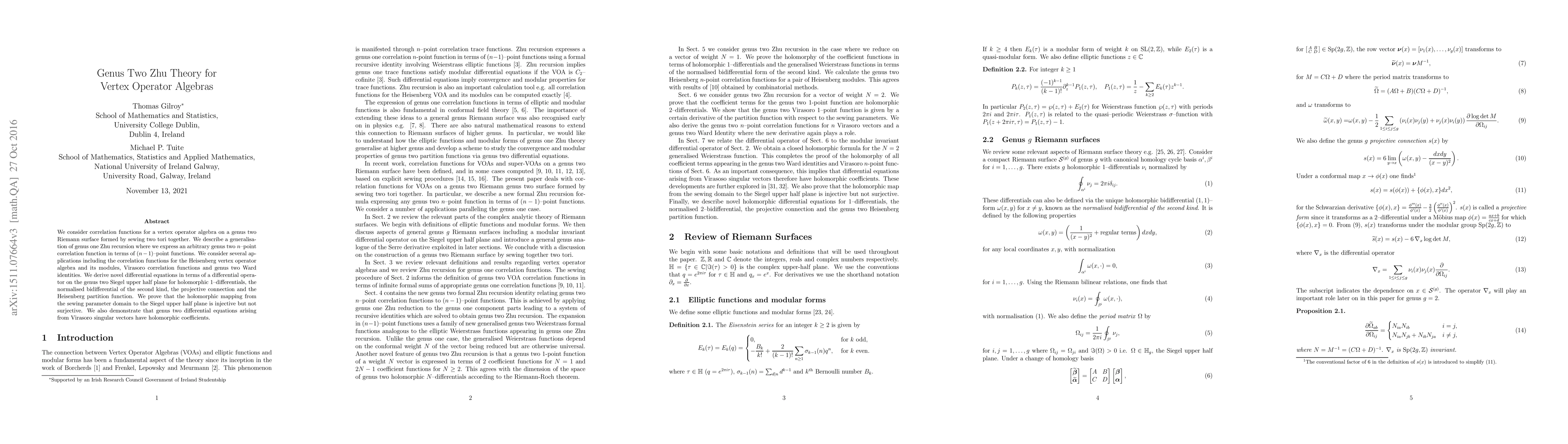 This paper extends Zhu theory to genus two surfaces, generalizing genus one recursion to express genus two $n$-point correlation functions in terms of $(n-1)$-point functions. It applies this to the Heisenberg vertex operator algebra, deriving novel differential equations for holomorphic $1$-differentials and proving injectivity of the holomorphic mapping from sewing parameters to the Siegel upper half plane.