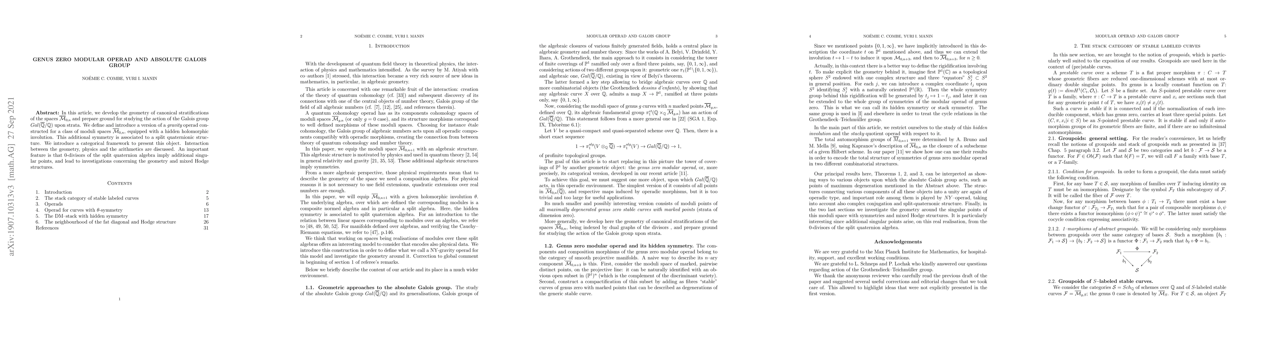 In this article, we develop the geometry of canonical stratifications of the spaces $\mathcal{M}_{0,n}$ and prepare ground for studying the action of the Galois group $Gal (\overline{\mathbb{Q}} /\mathbb{Q})$ upon strata. We define and introduce a version of a gravity operad constructed for a class of moduli spaces $\mathcal{M}_{0,n}$, equipped with a hidden holomorphic involution. This additional symmetry is associated to a split quaternionic structure. We introduce a categorical framework to present this object. Interaction between the geometry, physics and the arithmetics are discussed. An important feature is that 0-divisors of the split quaternion algebra imply additional singular points, and lead to investigations concerning the geometry and mixed Hodge structures.