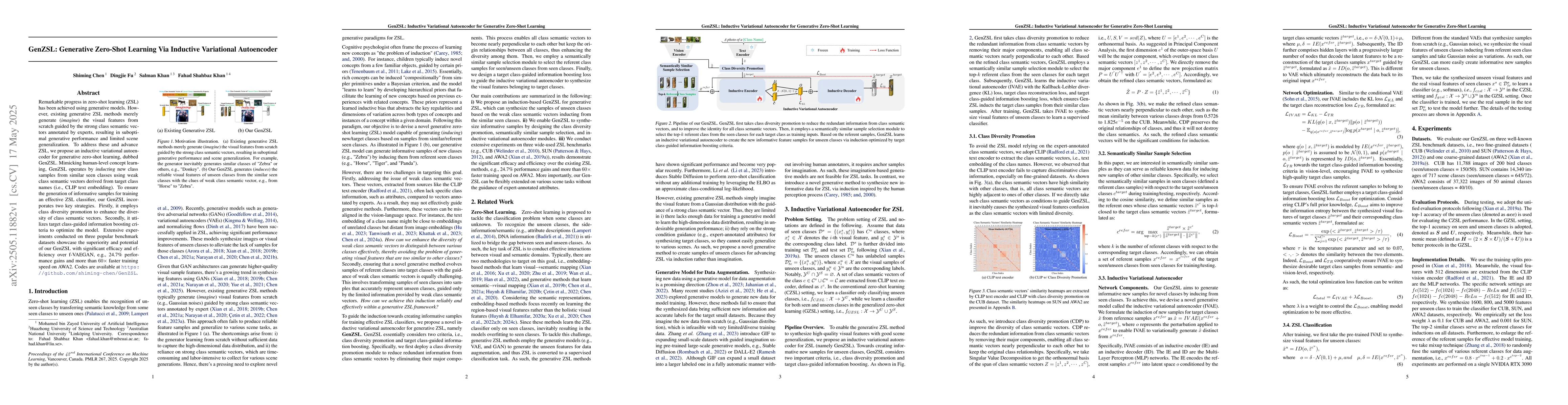 Remarkable progress in zero-shot learning (ZSL) has been achieved using generative models. However, existing generative ZSL methods merely generate (imagine) the visual features from scratch guided by the strong class semantic vectors annotated by experts, resulting in suboptimal generative performance and limited scene generalization. To address these and advance ZSL, we propose an inductive variational autoencoder for generative zero-shot learning, dubbed GenZSL. Mimicking human-level concept learning, GenZSL operates by inducting new class samples from similar seen classes using weak class semantic vectors derived from target class names (i.e., CLIP text embedding). To ensure the generation of informative samples for training an effective ZSL classifier, our GenZSL incorporates two key strategies. Firstly, it employs class diversity promotion to enhance the diversity of class semantic vectors. Secondly, it utilizes target class-guided information boosting criteria to optimize the model. Extensive experiments conducted on three popular benchmark datasets showcase the superiority and potential of our GenZSL with significant efficacy and efficiency over f-VAEGAN, e.g., 24.7% performance gains and more than $60\times$ faster training speed on AWA2. Codes are available at https://github.com/shiming-chen/GenZSL.