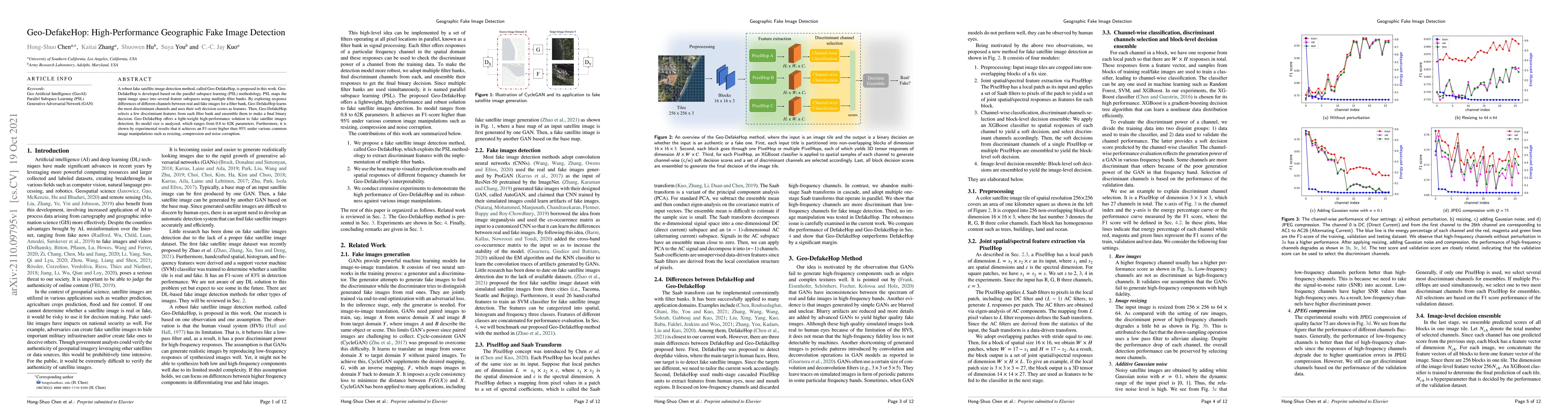 Geo-DefakeHop proposes a high-performance method for detecting fake satellite images using parallel subspace learning. It achieves an F1-score over 95% under various manipulations, demonstrating its robustness and efficiency.