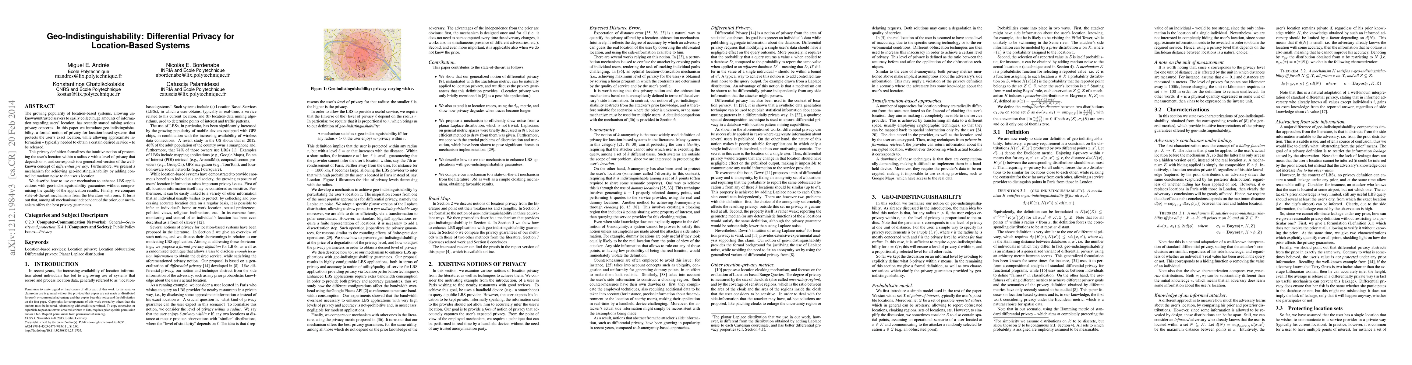 This paper introduces geo-indistinguishability, a novel privacy notion for location-based systems that protects users' exact locations while allowing approximate information release. The authors propose a perturbation technique to achieve this privacy model and demonstrate its effectiveness in a practical application.