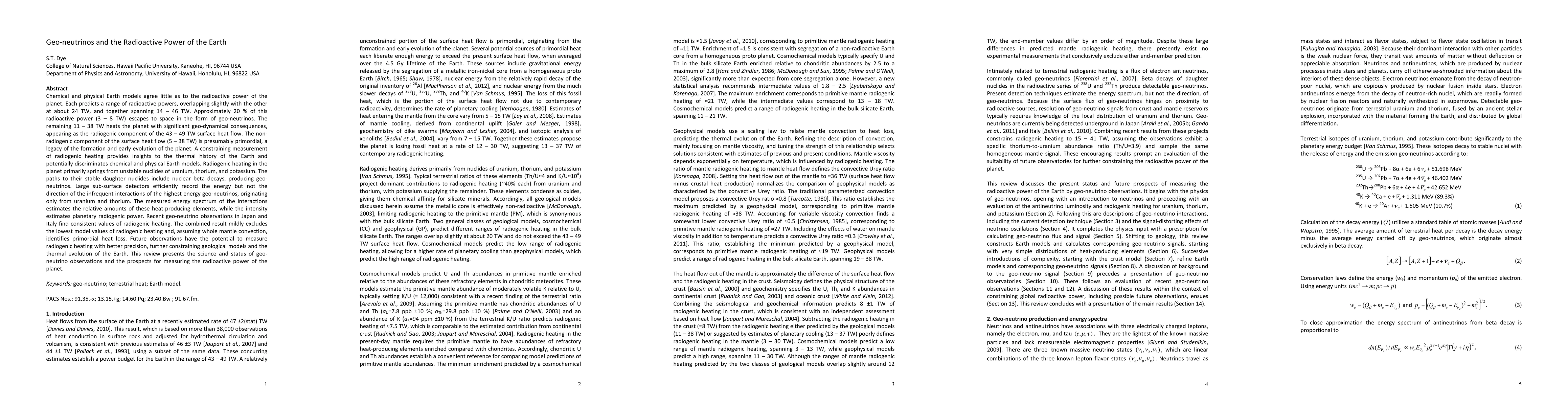 The paper discusses Earth's radioactive power, estimated at 14-46 TW from chemical and physical models, with 20% (3-8 TW) escaping as geo-neutrinos. Uranium, thorium, and potassium's decay contribute, detected by sub-surface observatories. Recent observations in Japan and Italy align, suggesting mild exclusion of lower radiogenic heating model values and indicating primordial heat loss. Future refinements could better constrain Earth's thermal evolution models.