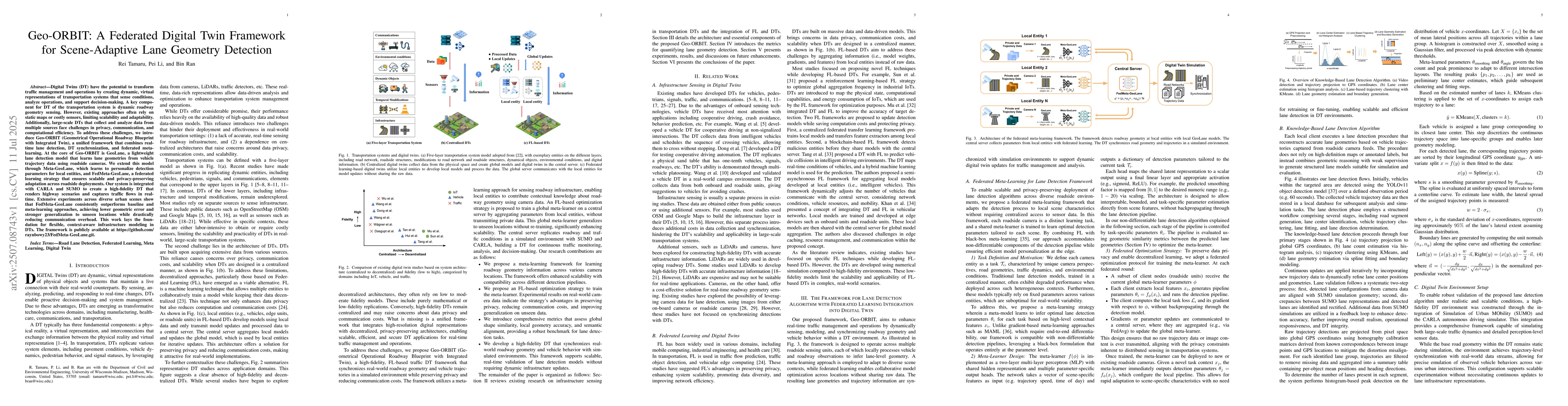 Digital Twins (DT) have the potential to transform traffic management and operations by creating dynamic, virtual representations of transportation systems that sense conditions, analyze operations, and support decision-making. A key component for DT of the transportation system is dynamic roadway geometry sensing. However, existing approaches often rely on static maps or costly sensors, limiting scalability and adaptability. Additionally, large-scale DTs that collect and analyze data from multiple sources face challenges in privacy, communication, and computational efficiency. To address these challenges, we introduce Geo-ORBIT (Geometrical Operational Roadway Blueprint with Integrated Twin), a unified framework that combines real-time lane detection, DT synchronization, and federated meta-learning. At the core of Geo-ORBIT is GeoLane, a lightweight lane detection model that learns lane geometries from vehicle trajectory data using roadside cameras. We extend this model through Meta-GeoLane, which learns to personalize detection parameters for local entities, and FedMeta-GeoLane, a federated learning strategy that ensures scalable and privacy-preserving adaptation across roadside deployments. Our system is integrated with CARLA and SUMO to create a high-fidelity DT that renders highway scenarios and captures traffic flows in real-time. Extensive experiments across diverse urban scenes show that FedMeta-GeoLane consistently outperforms baseline and meta-learning approaches, achieving lower geometric error and stronger generalization to unseen locations while drastically reducing communication overhead. This work lays the foundation for flexible, context-aware infrastructure modeling in DTs. The framework is publicly available at https://github.com/raynbowy23/FedMeta-GeoLane.git.