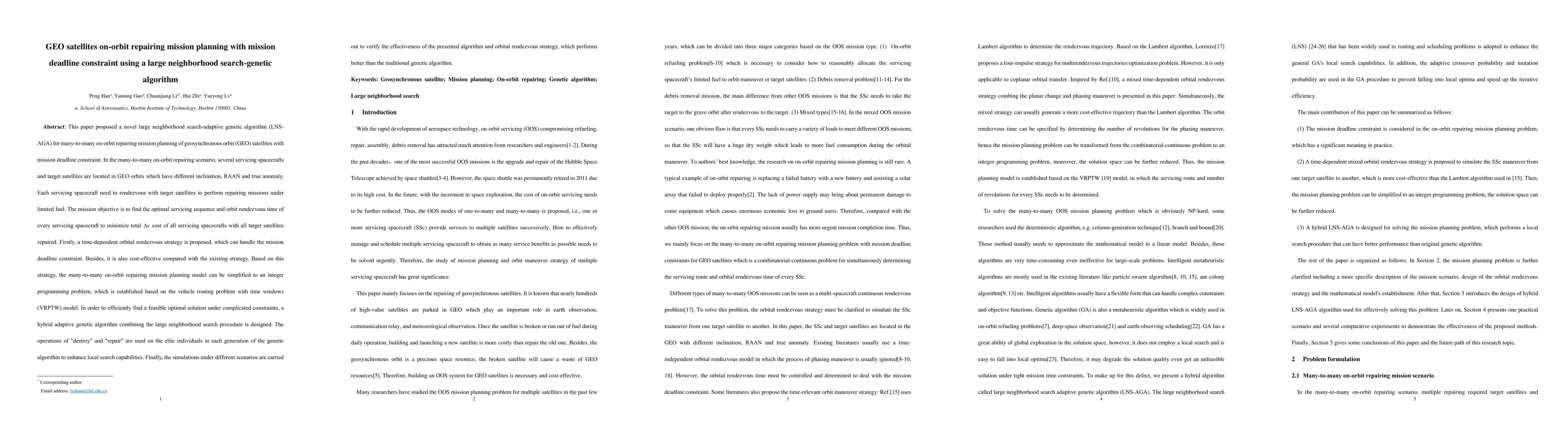 This paper proposed a novel large neighborhood search-adaptive genetic algorithm (LNS-AGA) for many-to-many on-orbit repairing mission planning of geosynchronous orbit (GEO) satellites with mission deadline constraint. In the many-to-many on-orbit repairing scenario, several servicing spacecrafts and target satellites are located in GEO orbits which have different inclination, RAAN and true anomaly. Each servicing spacecraft need to rendezvous with target satellites to perform repairing missions under limited fuel. The mission objective is to find the optimal servicing sequence and orbit rendezvous time of every servicing spacecraft to minimize total cost of all servicing spacecrafts with all target satellites repaired. Firstly, a time-dependent orbital rendezvous strategy is proposed, which can handle the mission deadline constraint. Besides, it is also cost-effective compared with the existing strategy. Based on this strategy, the many-to-many on-orbit repairing mission planning model can be simplified to an integer programming problem, which is established based on the vehicle routing problem with time windows (VRPTW) model. In order to efficiently find a feasible optimal solution under complicated constraints, a hybrid adaptive genetic algorithm combining the large neighborhood search procedure is designed. The operations of "destroy" and "repair" are used on the elite individuals in each generation of the genetic algorithm to enhance local search capabilities. Finally, the simulations under different scenarios are carried out to verify the effectiveness of the presented algorithm and orbital rendezvous strategy, which performs better than the traditional genetic algorithm.