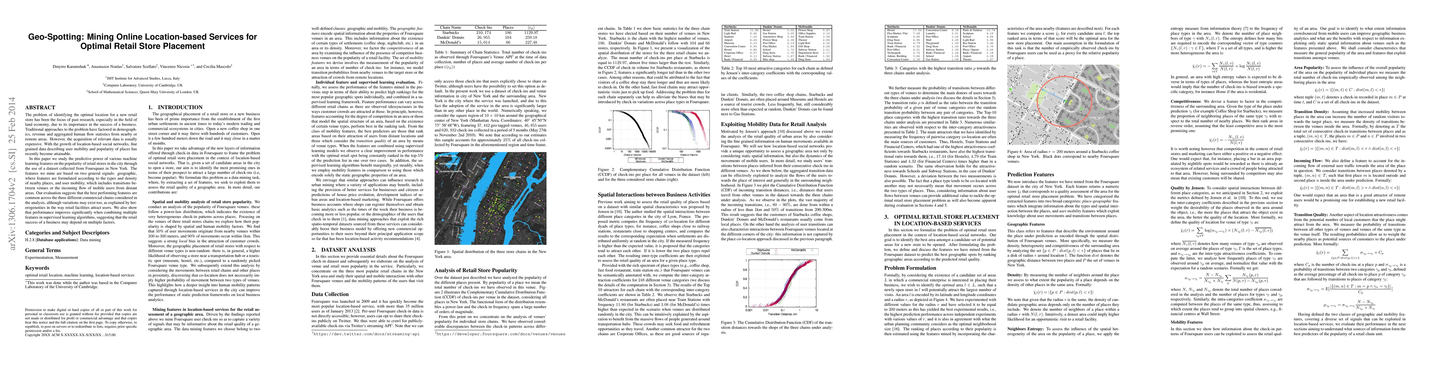 This paper explores optimal retail store placement using machine learning features derived from geo-tagged social media data, specifically Foursquare, to predict store popularity in New York. It finds that geographic and user mobility features, when combined, significantly enhance predictive performance, indicating that retail success depends on multiple interrelated factors.