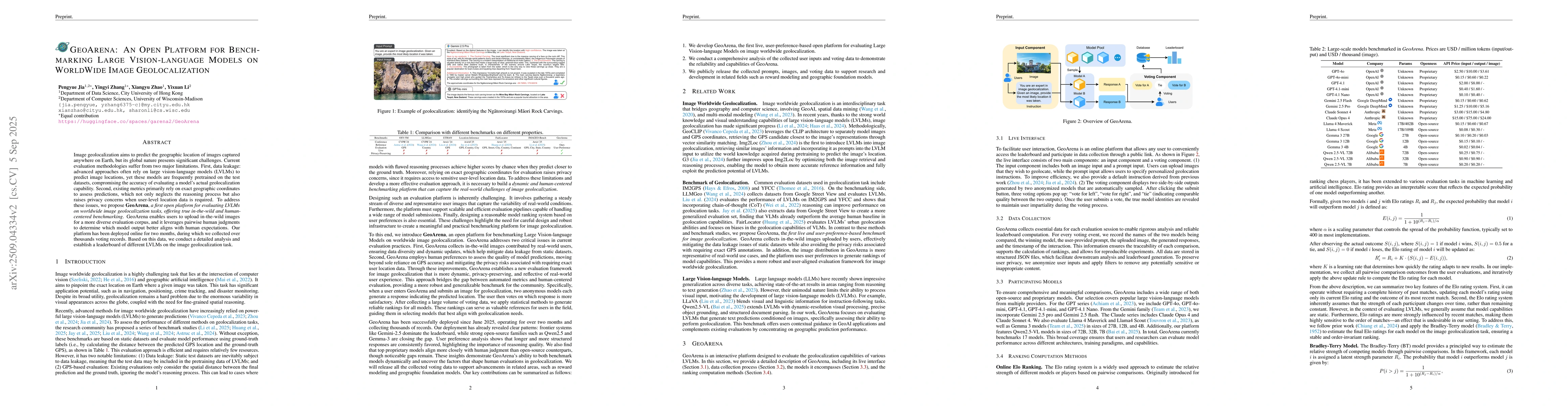 Image geolocalization aims to predict the geographic location of images captured anywhere on Earth, but its global nature presents significant challenges. Current evaluation methodologies suffer from two major limitations. First, data leakage: advanced approaches often rely on large vision-language models (LVLMs) to predict image locations, yet these models are frequently pretrained on the test datasets, compromising the accuracy of evaluating a model's actual geolocalization capability. Second, existing metrics primarily rely on exact geographic coordinates to assess predictions, which not only neglects the reasoning process but also raises privacy concerns when user-level location data is required. To address these issues, we propose GeoArena, a first open platform for evaluating LVLMs on worldwide image geolocalization tasks, offering true in-the-wild and human-centered benchmarking. GeoArena enables users to upload in-the-wild images for a more diverse evaluation corpus, and it leverages pairwise human judgments to determine which model output better aligns with human expectations. Our platform has been deployed online for two months, during which we collected over thousands voting records. Based on this data, we conduct a detailed analysis and establish a leaderboard of different LVLMs on the image geolocalization task.