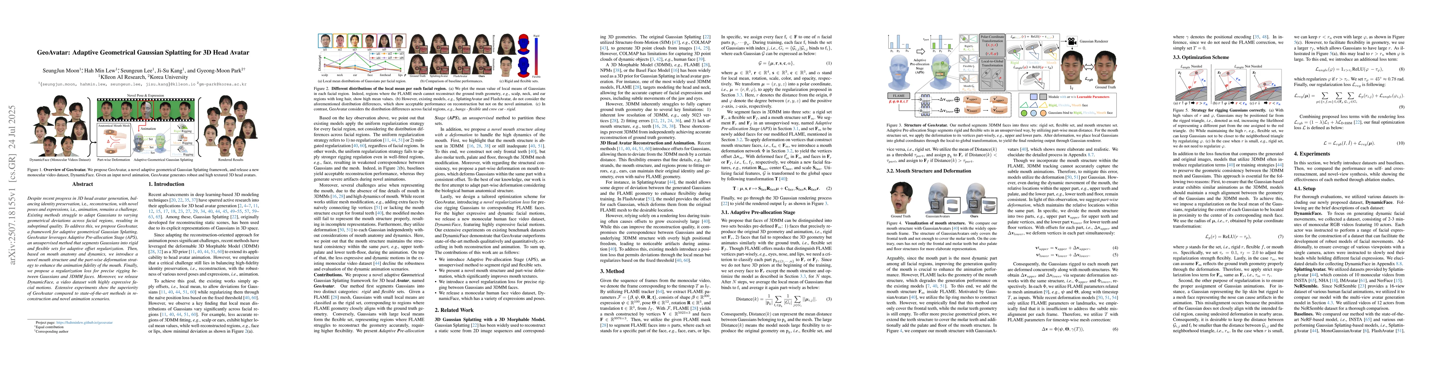 Despite recent progress in 3D head avatar generation, balancing identity preservation, i.e., reconstruction, with novel poses and expressions, i.e., animation, remains a challenge. Existing methods struggle to adapt Gaussians to varying geometrical deviations across facial regions, resulting in suboptimal quality. To address this, we propose GeoAvatar, a framework for adaptive geometrical Gaussian Splatting. GeoAvatar leverages Adaptive Pre-allocation Stage (APS), an unsupervised method that segments Gaussians into rigid and flexible sets for adaptive offset regularization. Then, based on mouth anatomy and dynamics, we introduce a novel mouth structure and the part-wise deformation strategy to enhance the animation fidelity of the mouth. Finally, we propose a regularization loss for precise rigging between Gaussians and 3DMM faces. Moreover, we release DynamicFace, a video dataset with highly expressive facial motions. Extensive experiments show the superiority of GeoAvatar compared to state-of-the-art methods in reconstruction and novel animation scenarios.