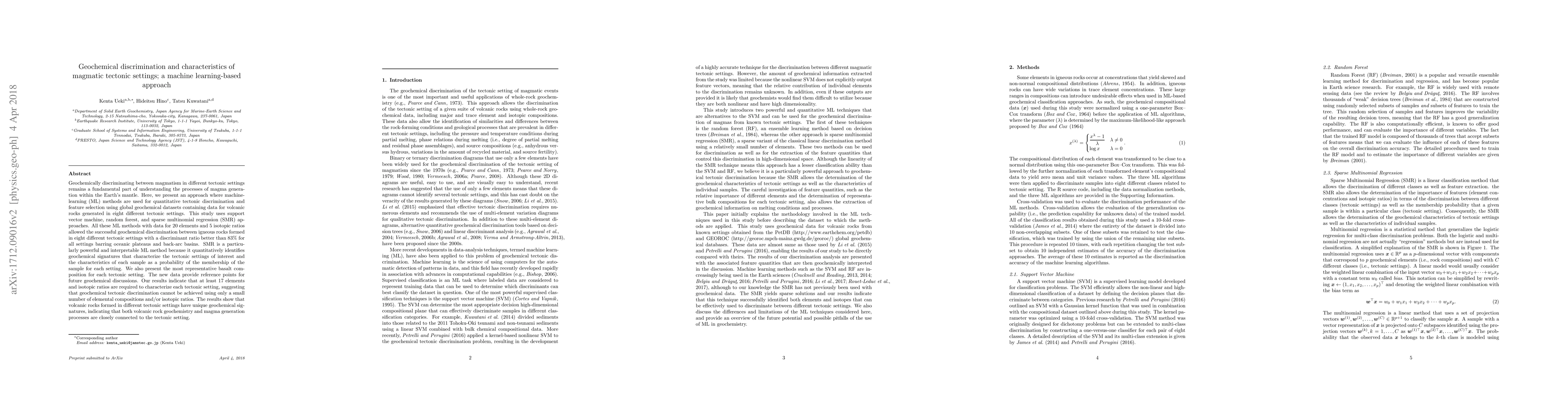 Geochemically discriminating between magmatism in different tectonic settings remains a fundamental part of understanding the processes of magma generation within the Earth's mantle. Here, we present an approach where machine-learning (ML) methods are used for quantitative tectonic discrimination and feature selection using global geochemical datasets containing data for volcanic rocks generated in eight different tectonic settings. This study uses support vector machine, random forest, and sparse multinomial regression (SMR) approaches. All these ML methods with data for 20 elements and 5 isotopic ratios allowed the successful geochemical discrimination between igneous rocks formed in eight different tectonic settings with a discriminant ratio better than 83% for all settings barring oceanic plateaus and back-arc basins. SMR is a particularly powerful and interpretable ML method because it quantitatively identifies geochemical signatures that characterize the tectonic settings of interest and the characteristics of each sample as a probability of the membership of the sample for each setting. We also present the most representative basalt composition for each tectonic setting. The new data provide reference points for future geochemical discussions. Our results indicate that at least 17 elements and isotopic ratios are required to characterize each tectonic setting, suggesting that geochemical tectonic discrimination cannot be achieved using only a small number of elemental compositions and/or isotopic ratios. The results show that volcanic rocks formed in different tectonic settings have unique geochemical signatures, indicating that both volcanic rock geochemistry and magma generation processes are closely connected to the tectonic setting.