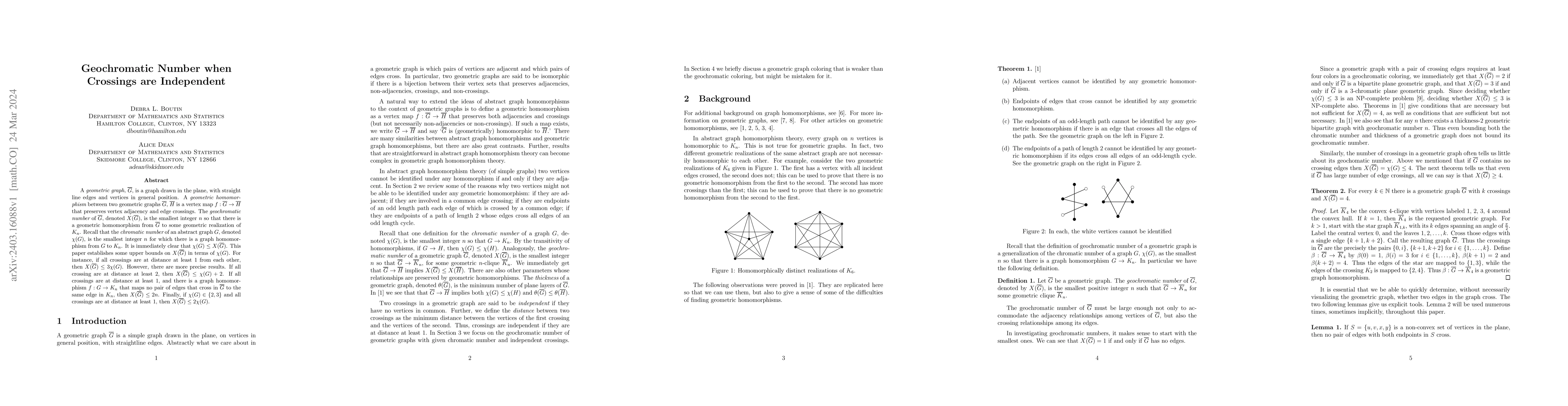 This paper investigates the geochromatic number $X(\overline{G})$ for geometric graphs, establishing upper bounds based on the chromatic number $\chi(G)$ of the corresponding abstract graph, especially under conditions on the independence of edge crossings. The findings show that $X(\overline{G})$ can be bounded by multiples of $\chi(G)$ depending on the spatial distance between crossings.