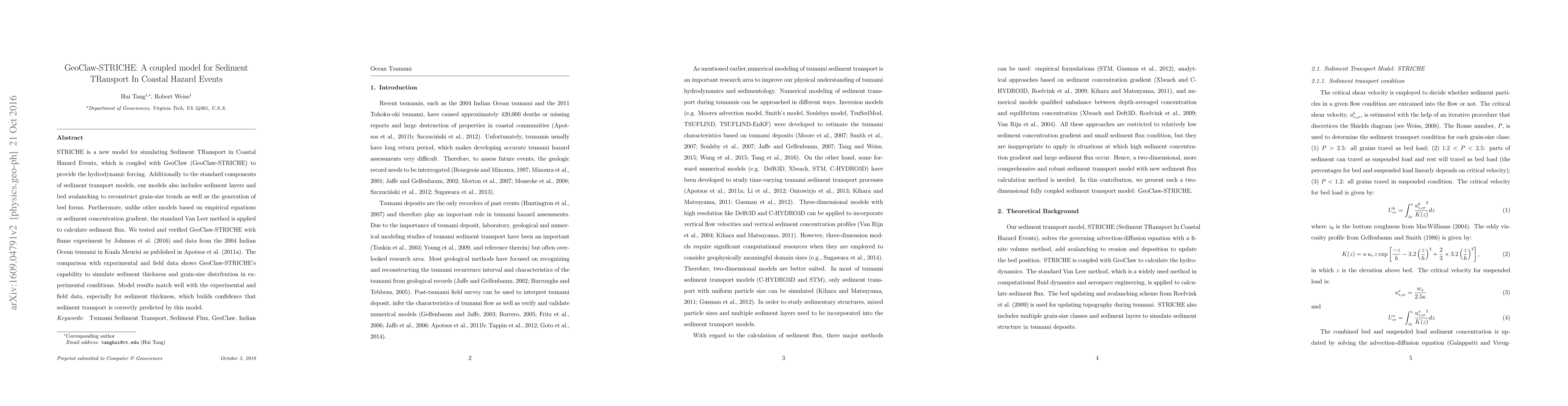 GeoClaw-STRICHE is a coupled model for simulating sediment transport during coastal hazard events, integrating nonlinear shallow water equations, advection-diffusion, and morphology updating. It uses the Van Leer method for sediment flux calculation and was validated with flume experiments and data from the 2004 Indian Ocean tsunami, showing good agreement and superior sediment transport predictions.