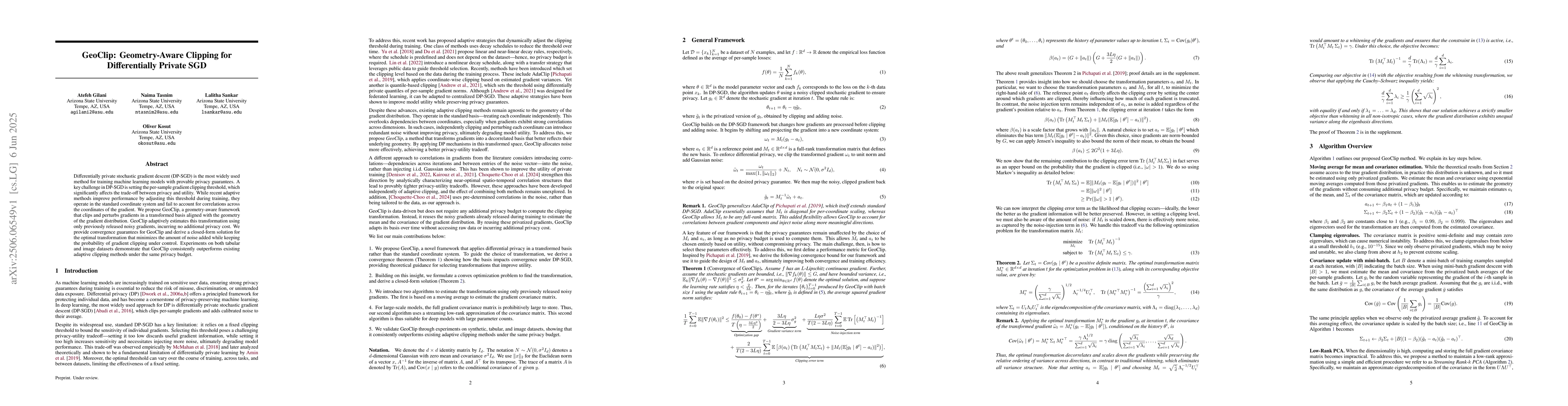 GeoClip improves differential privacy in stochastic gradient descent by adapting to gradient correlations using a geometry-aware framework that minimizes noise while controlling clipping probability.