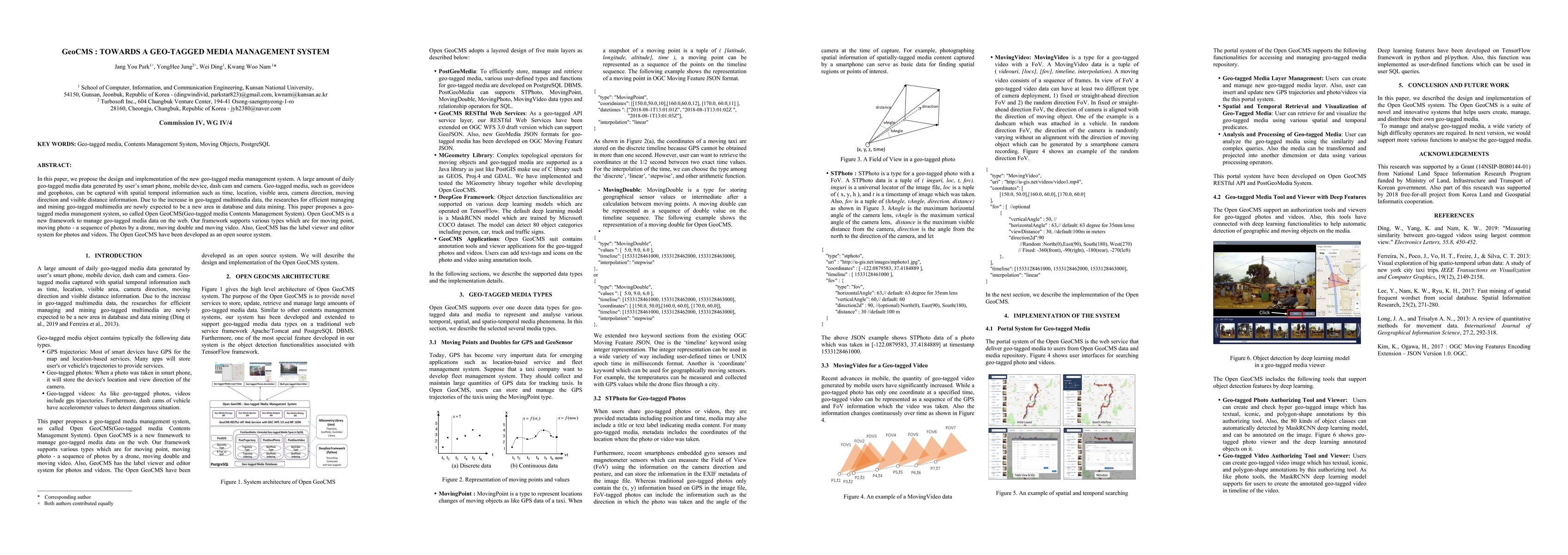 This paper introduces Open GeoCMS, a geo-tagged media management system designed to handle and organize large volumes of geo-tagged multimedia data, including geovideos and geophotos, with spatial and temporal metadata. The system supports various data types and features a label viewer and editor for enhanced user interaction.
