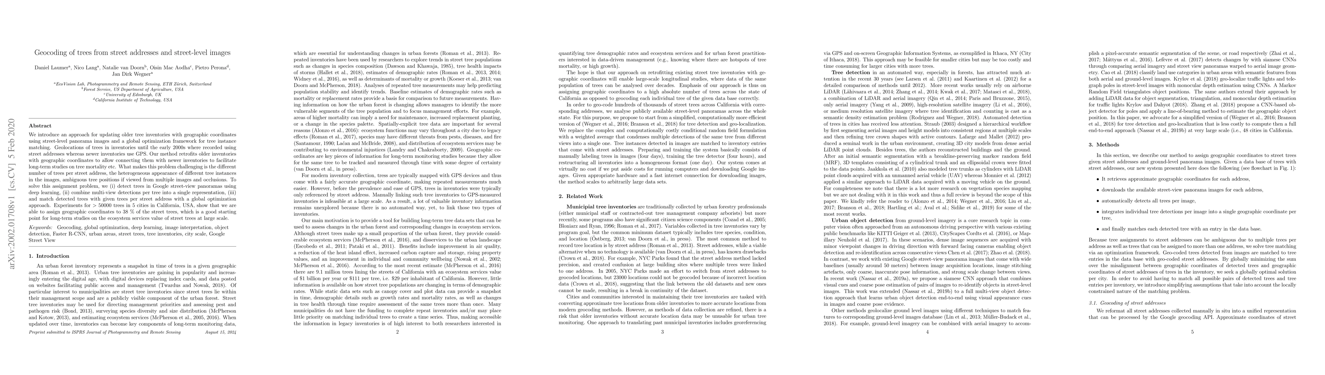 This paper presents a method for updating old tree inventories with geographic coordinates using street-level panorama images and a global optimization framework. The approach detects trees in Google Street View images, combines multi-view detections, and matches them to street addresses, successfully assigning coordinates to 38% of street trees in California.