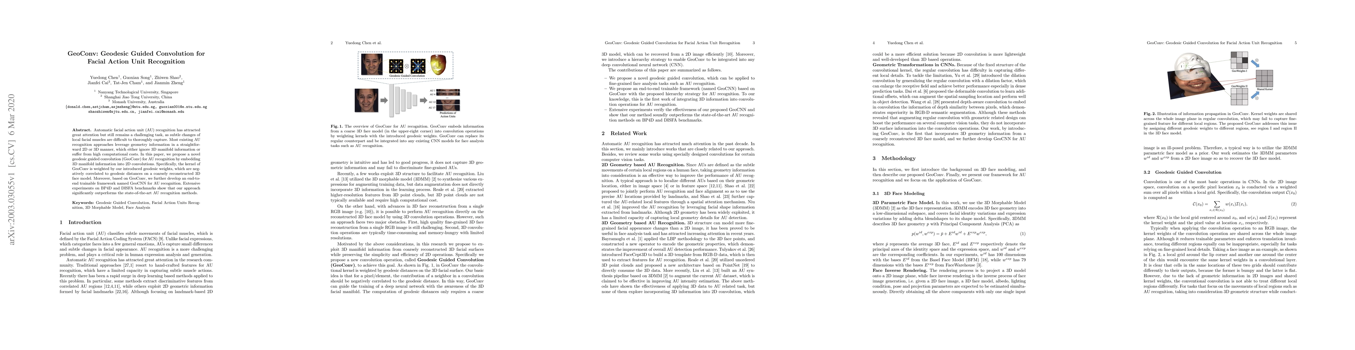 The paper proposes GeoConv, a geodesic guided convolution method that embeds 3D manifold information into 2D convolutions to enhance facial action unit recognition. The method uses geodesic weights to improve the capture of subtle facial muscle changes, leading to a superior end-to-end trainable framework, GeoCNN, which outperforms existing state-of-the-art methods on BP4D and DISFA benchmarks.