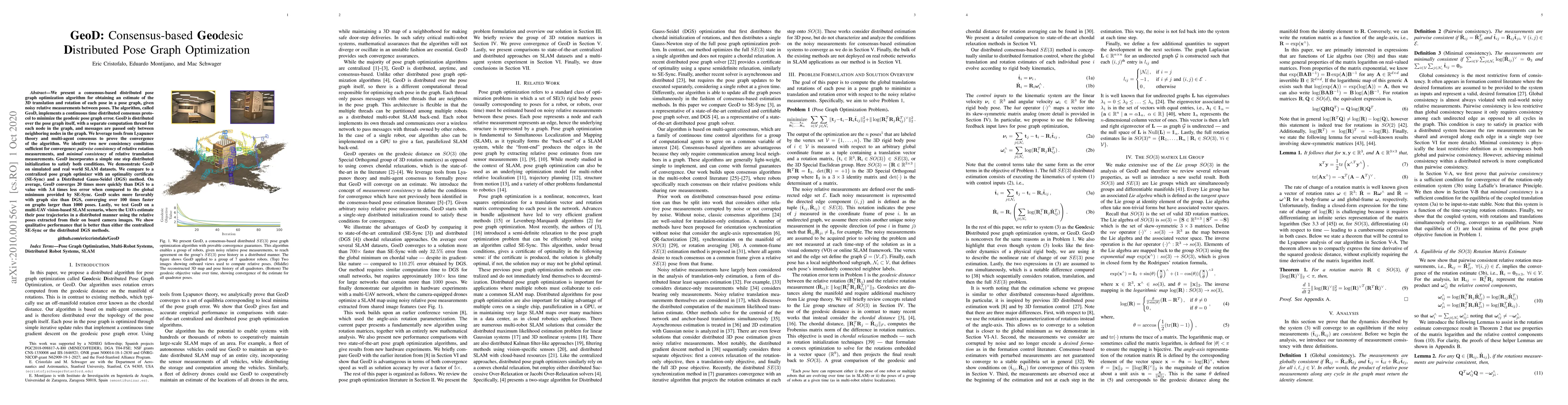 GeoD is a consensus-based distributed algorithm for optimizing pose graphs to estimate 3D translation and rotation, leveraging continuous time consensus protocols and Lyapunov theory for convergence. It outperforms distributed and centralized competitors in speed and error reduction, especially on large graphs and in multi-UAV vision-based SLAM scenarios.