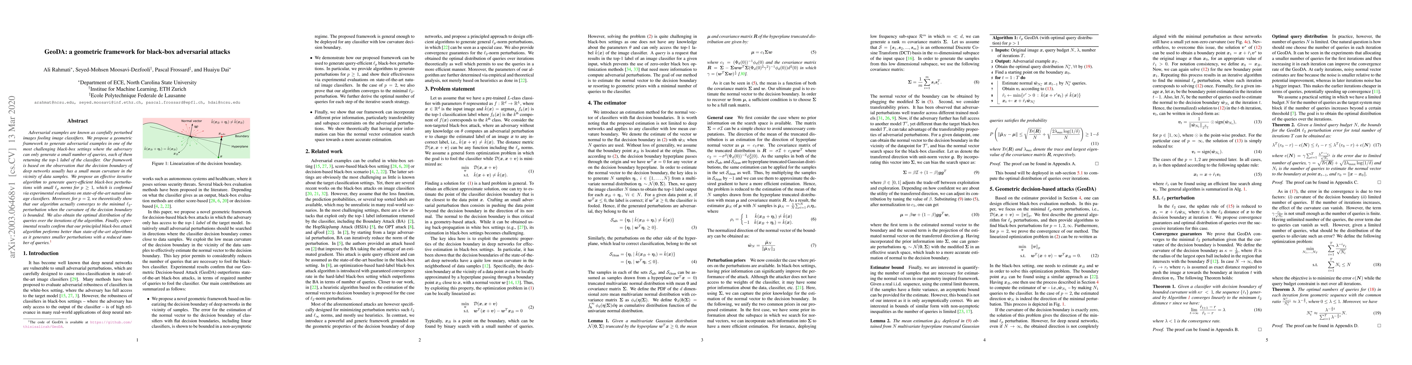 Adversarial examples are known as carefully perturbed images fooling image classifiers. We propose a geometric framework to generate adversarial examples in one of the most challenging black-box settings where the adversary can only generate a small number of queries, each of them returning the top-$1$ label of the classifier. Our framework is based on the observation that the decision boundary of deep networks usually has a small mean curvature in the vicinity of data samples. We propose an effective iterative algorithm to generate query-efficient black-box perturbations with small $\ell_p$ norms for $p \ge 1$, which is confirmed via experimental evaluations on state-of-the-art natural image classifiers. Moreover, for $p=2$, we theoretically show that our algorithm actually converges to the minimal $\ell_2$-perturbation when the curvature of the decision boundary is bounded. We also obtain the optimal distribution of the queries over the iterations of the algorithm. Finally, experimental results confirm that our principled black-box attack algorithm performs better than state-of-the-art algorithms as it generates smaller perturbations with a reduced number of queries.