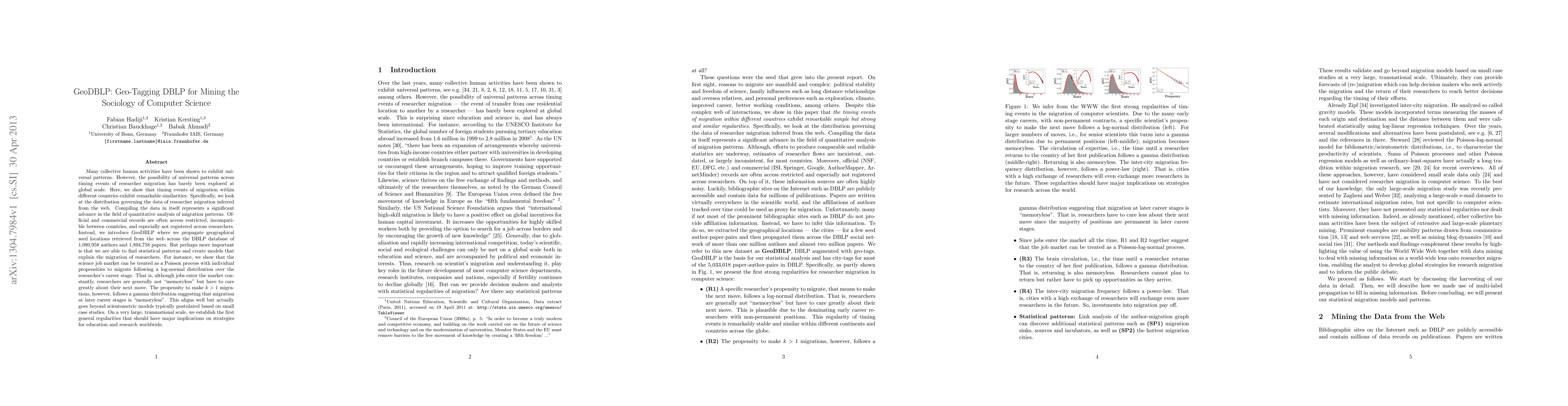 Many collective human activities have been shown to exhibit universal patterns. However, the possibility of universal patterns across timing events of researcher migration has barely been explored at global scale. Here, we show that timing events of migration within different countries exhibit remarkable similarities. Specifically, we look at the distribution governing the data of researcher migration inferred from the web. Compiling the data in itself represents a significant advance in the field of quantitative analysis of migration patterns. Official and commercial records are often access restricted, incompatible between countries, and especially not registered across researchers. Instead, we introduce GeoDBLP where we propagate geographical seed locations retrieved from the web across the DBLP database of 1,080,958 authors and 1,894,758 papers. But perhaps more important is that we are able to find statistical patterns and create models that explain the migration of researchers. For instance, we show that the science job market can be treated as a Poisson process with individual propensities to migrate following a log-normal distribution over the researcher's career stage. That is, although jobs enter the market constantly, researchers are generally not "memoryless" but have to care greatly about their next move. The propensity to make k>1 migrations, however, follows a gamma distribution suggesting that migration at later career stages is "memoryless". This aligns well but actually goes beyond scientometric models typically postulated based on small case studies. On a very large, transnational scale, we establish the first general regularities that should have major implications on strategies for education and research worldwide.