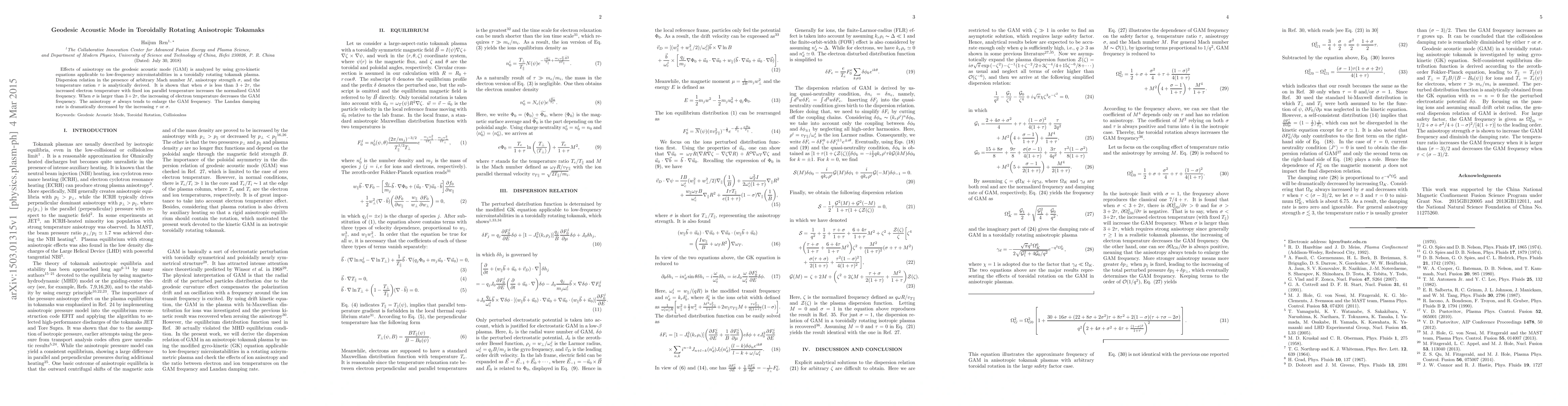 This paper analyzes the effects of anisotropy on the geodesic acoustic mode (GAM) in toroidally rotating tokamak plasmas using gyro-kinetic equations. It finds that anisotropy increases the GAM frequency, while electron temperature influences the frequency differently depending on the anisotropy strength and temperature ratio.