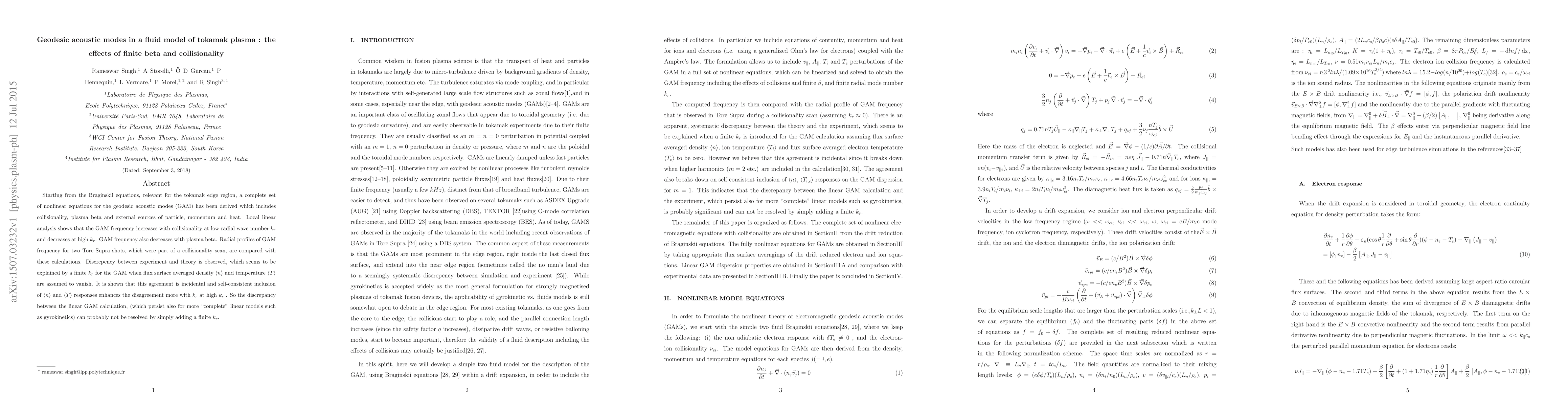This paper derives nonlinear equations for geodesic acoustic modes (GAM) in tokamak plasma, considering collisionality and plasma beta. It finds that GAM frequency increases with collisionality at low radial wave number but decreases with plasma beta, and highlights discrepancies between theoretical predictions and experimental data from Tore Supra, suggesting that the inclusion of finite $k_{r}$ does not resolve these discrepancies.