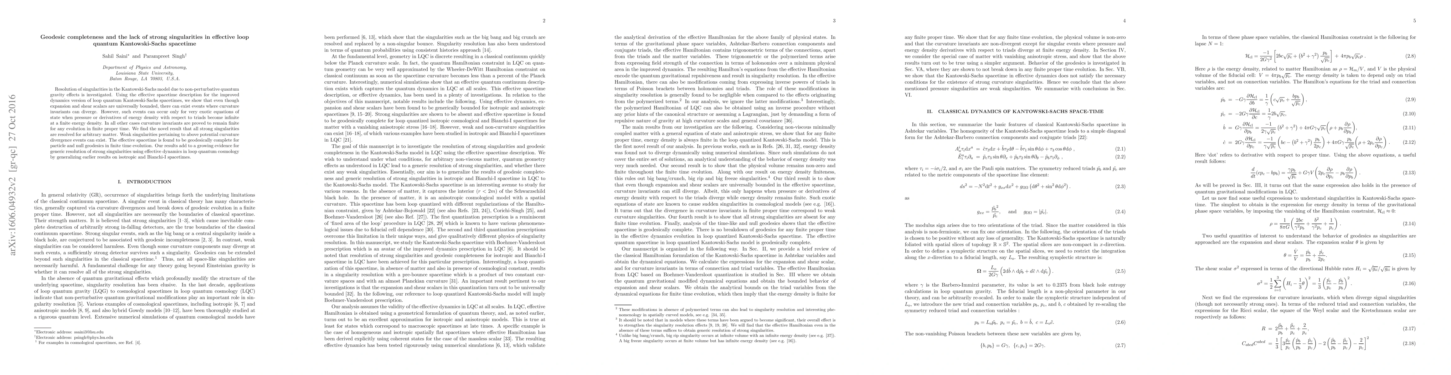 This paper investigates the resolution of singularities in loop quantum Kantowski-Sachs spacetimes, showing that strong singularities are resolved for typical matter conditions while weak singularities may exist under exotic equations of state. The effective spacetime is found to be geodesically complete.