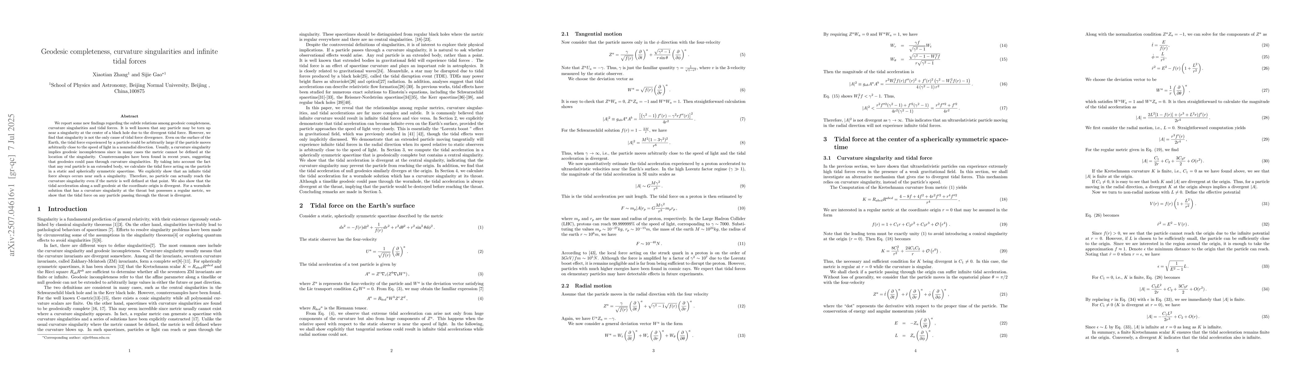 We report some new findings regarding the subtle relations among geodesic completeness, curvature singularities and tidal forces. It is well known that any particle may be torn up near a singularity at the center of a black hole due to the divergent tidal force. However, we find that singularity is not the only cause of tidal force divergence. Even on the surface of the Earth, the tidal force experienced by a particle could be arbitrarily large if the particle moves arbitrarily close to the speed of light in a nonradial direction. Usually, a curvature singularity implies geodesic incompleteness since in many cases the metric cannot be defined at the location of the singularity. Counterexamples have been found in recent years, suggesting that geodesics could pass through curvature singularities. By taking into account the fact that any real particle is an extended body, we calculate the tidal force acting on the particle in a static and spherically symmetric spacetime. We explicitly show that an infinite tidal force always occurs near such a singularity. Therefore, no particle can actually reach the curvature singularity even if the metric is well defined at that point. We also show that the tidal acceleration along a null geodesic at the coordinate origin is divergent. For a wormhole solution that has a curvature singularity at the throat but possesses a regular metric, we show that the tidal force on any particle passing through the throat is divergent.