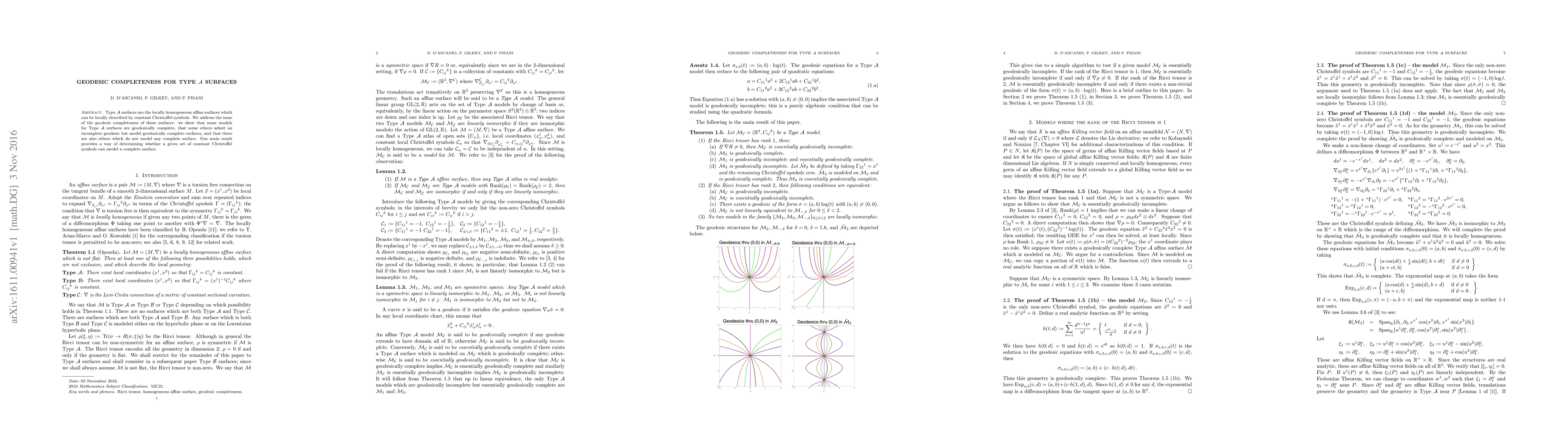 Researchers investigate geodesic completeness on Type A surfaces, a type of homogeneous affine surface, and find that some models can model complete surfaces while others cannot.