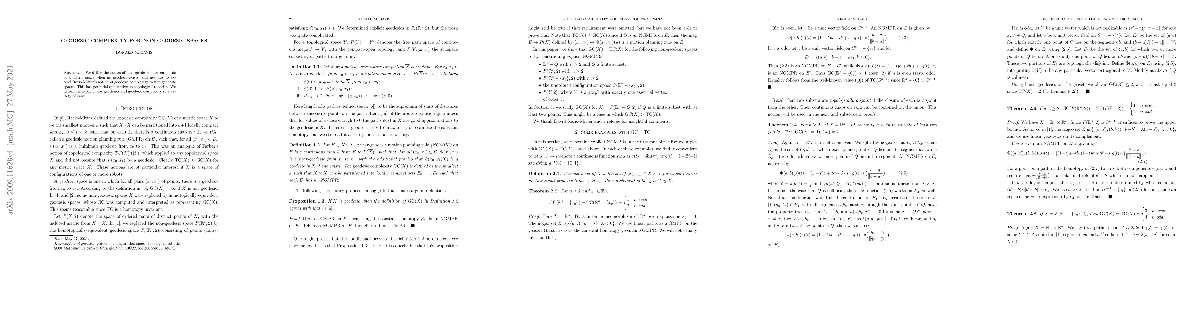 We define the notion of near geodesic between points of a metric space when no geodesic exists, and use this to extend Recio-Mitter's notion of geodesic complexity to non-geodesic spaces. This has potential application to topological robotics. We determine explicit near geodesics and geodesic complexity in a variety of cases.